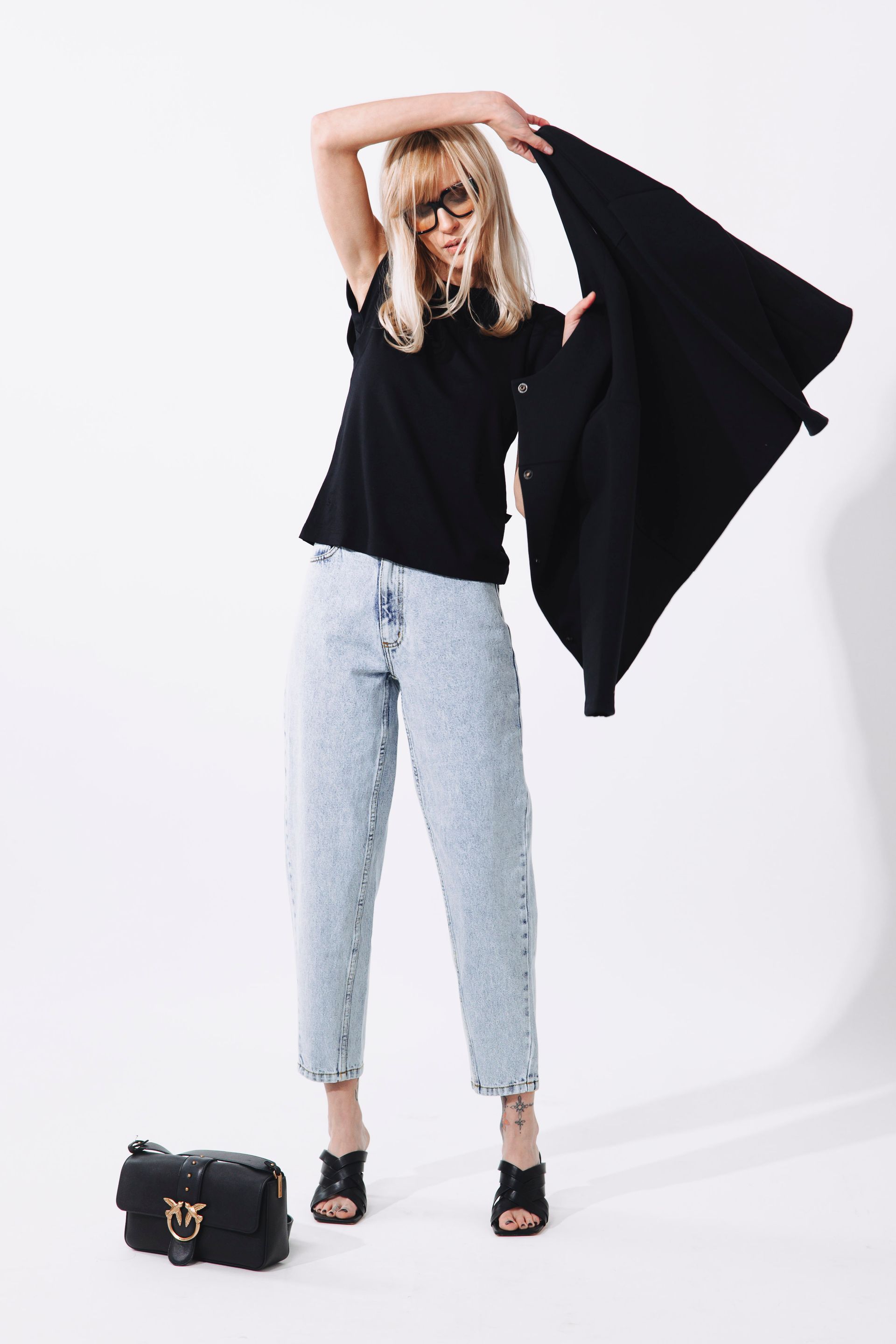 Tento minimalistický urban outfit v sobě spojuje ležérnost i sofistikovanou eleganci a představuje dokonalý základ pro moderní městský šatník. Hlavním pilířem jsou denimové kalhoty Luna ve světlém odstínu, které díky svému uvolněnému střihu zajišťují celodenní komfort a skvěle kontrastují s černým tričkem Kimani, jehož výrazné členění na rukávech dodává celku moderní strukturu a netradiční siluetu. Celý look pak sjednocuje a povyšuje na novou úroveň černý bomber Femi, jenž svou minimalistickou estetikou dodává outfitu potřebný „edge“. Pro dosažení autentického stylu z fotografií doporučujeme kombinaci doplnit výraznými brýlemi, elegantními pantoflíčky na podpatku a kabelkou s kovovými detaily, čímž vytvoříte nadčasový outfit, který vás sebevědomě doprovodí od ranních schůzek až po večerní drink.