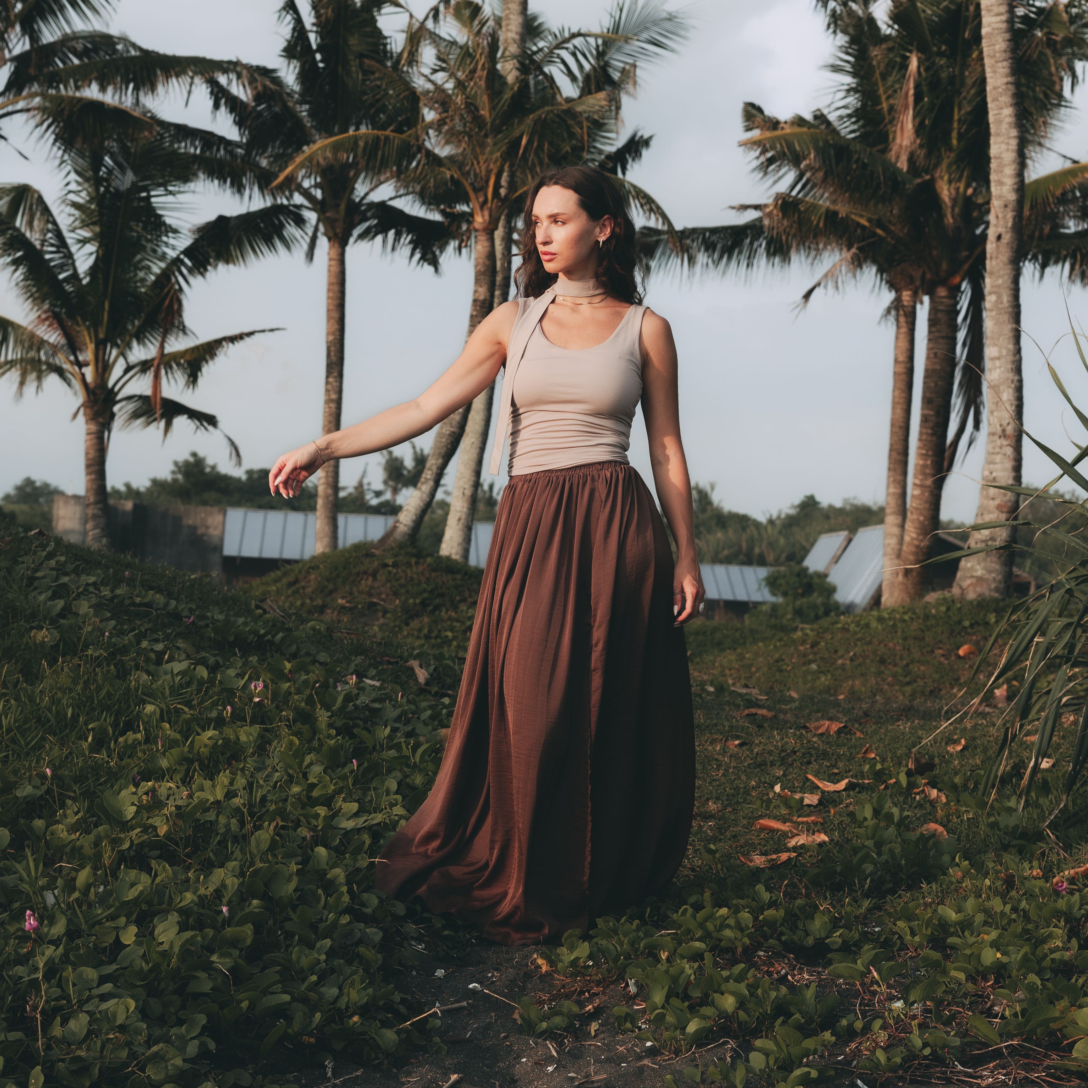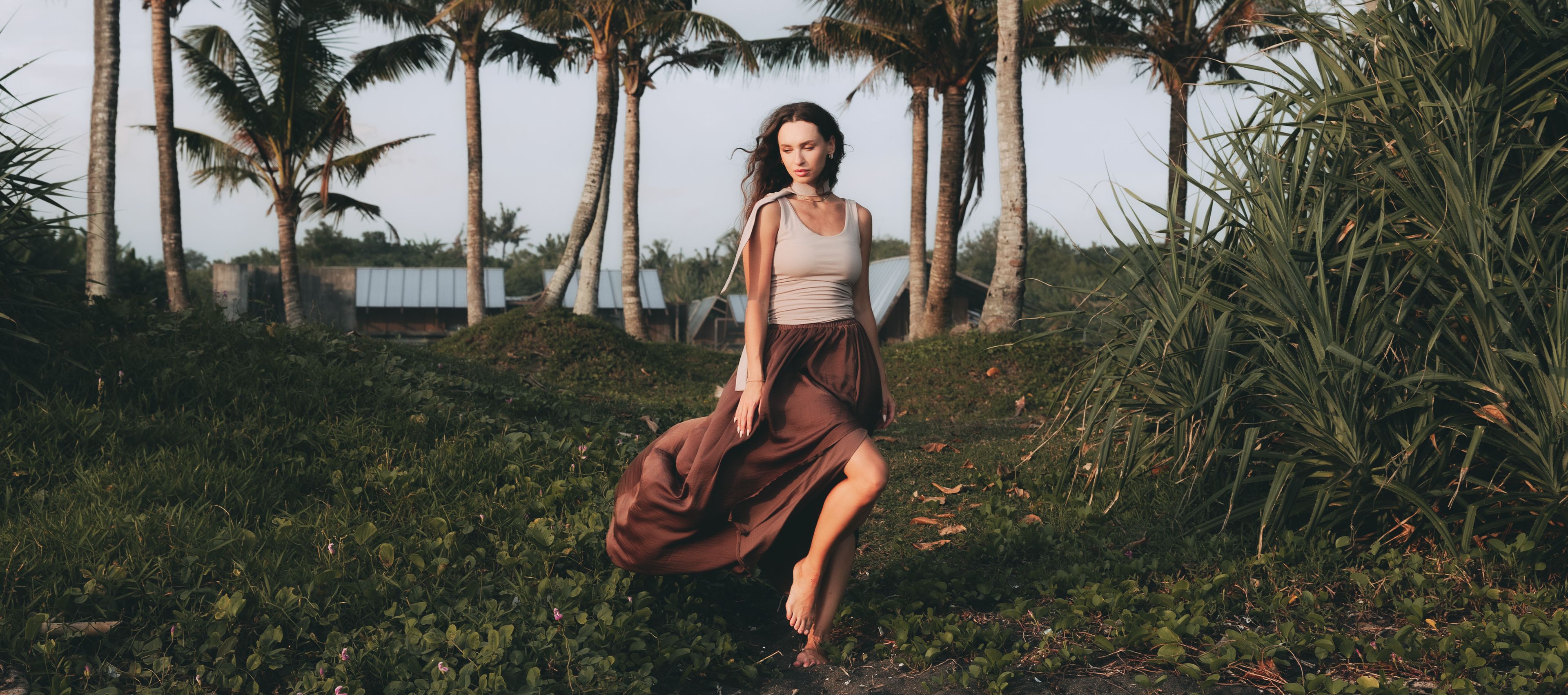 Tento outfit je naší srdeční záležitostí a čistou esencí nespoutaného Bali. Propojili jsme v něm luxusní maxi sukni Reta s rafinovaným topem Adia s odhalenými zády. Zkombinujte k nim i naši stylovou tašku Leya a jste připravena vyrazit do ulic. Vytvořili jsme tak harmonii, která vám dodá naprostou jistotu na důležité schůzce i při uvolněném nedělním brunchi. A když letní podvečer mírně ochladne? Stačí přes ramena nonšalantně přehodit top Atai.