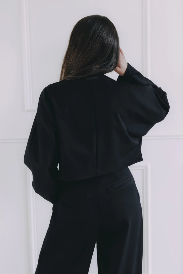 Ano, cropped střih (zkrácená délka) je pro šaty naprosto ideální! Blejzr Amadu končí v pase, což zvýrazňuje siluetu, aniž by zakrýval detaily šatů nebo sukně. Skvěle funguje například s upnutými midi šaty.