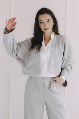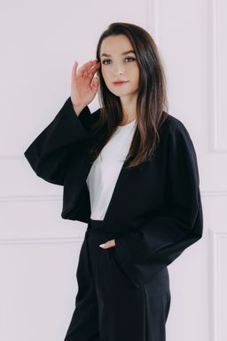 Ano, cropped střih (zkrácená délka) je pro šaty naprosto ideální! Blejzr Amadu končí v pase, což zvýrazňuje siluetu, aniž by zakrýval detaily šatů nebo sukně. Skvěle funguje například s upnutými midi šaty.