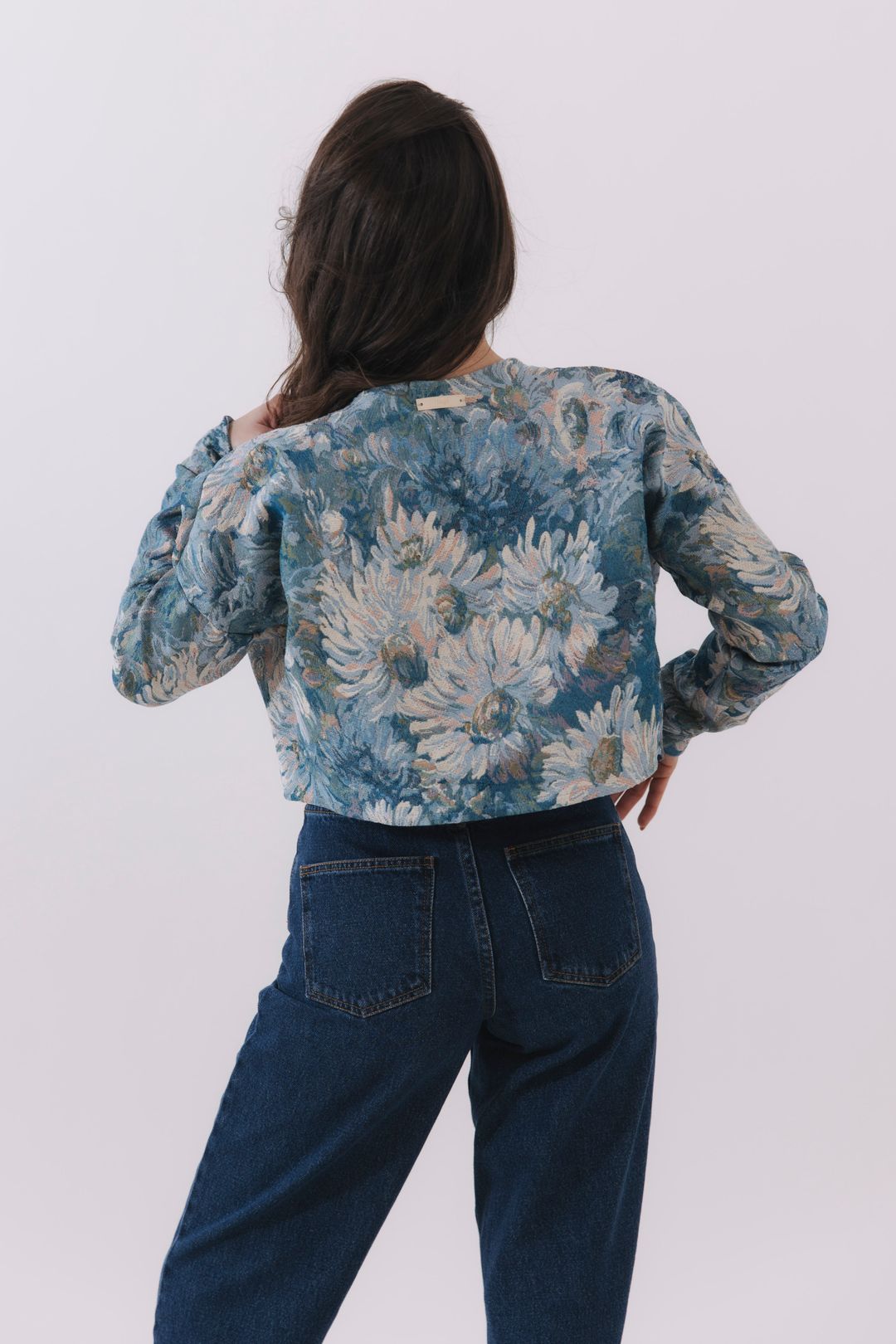- Vzor a barva: Modrý podklad doplňuje jemně tkaný květinový vzor, který dodává látce hloubku a přirozenou eleganci. Nestárnoucí vzor přidá vašemu outfitu na uměleckém dojmu (ideální do galerie a do divadla).