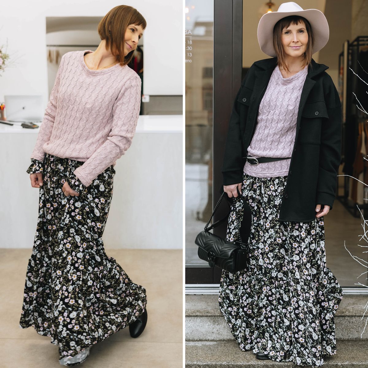 „Šaty Anva Boho, starorůžový svetřík Zakir Rose a přehozený kabátek Zunu Black jsou pohlazení pro moji romantickou duši. Volné, jemné a pohodlné. S bundičkou a kloboukem je to dokonalost sama,“ říká Pája s rozzářenýma očima.