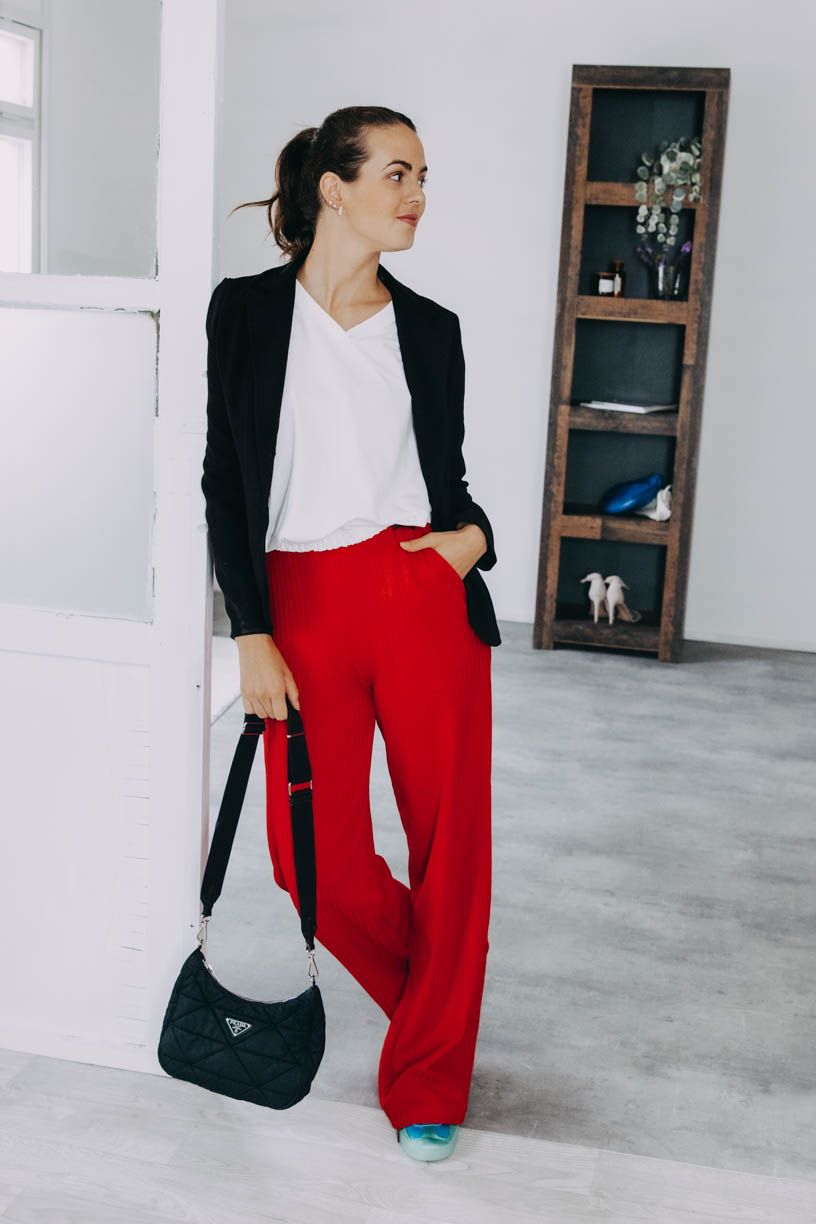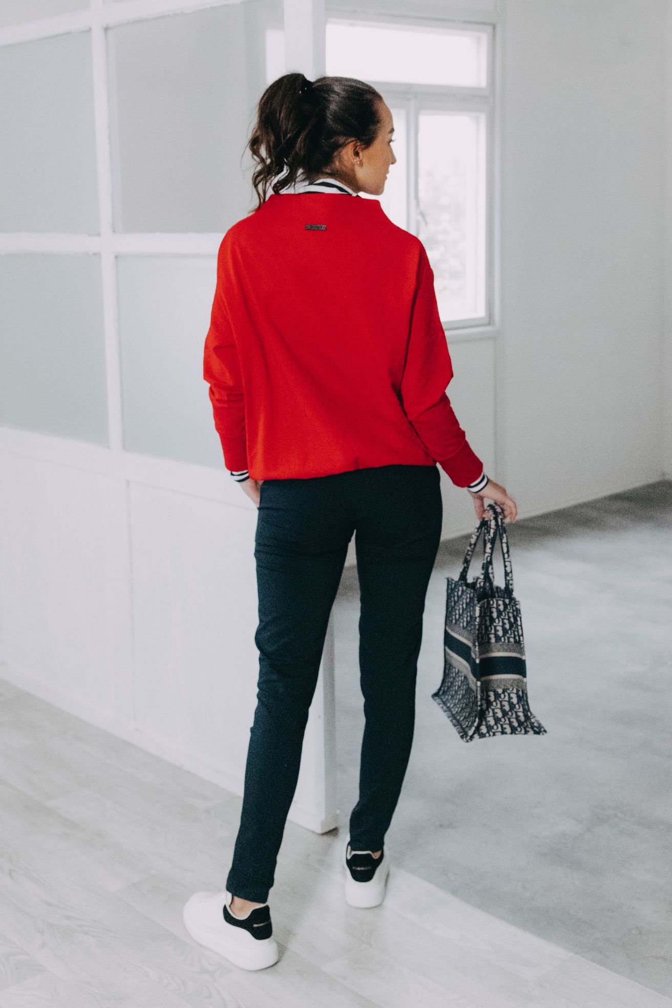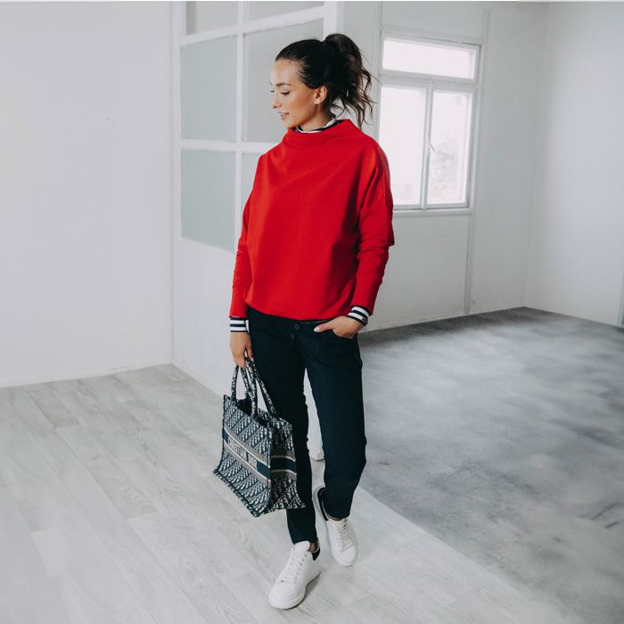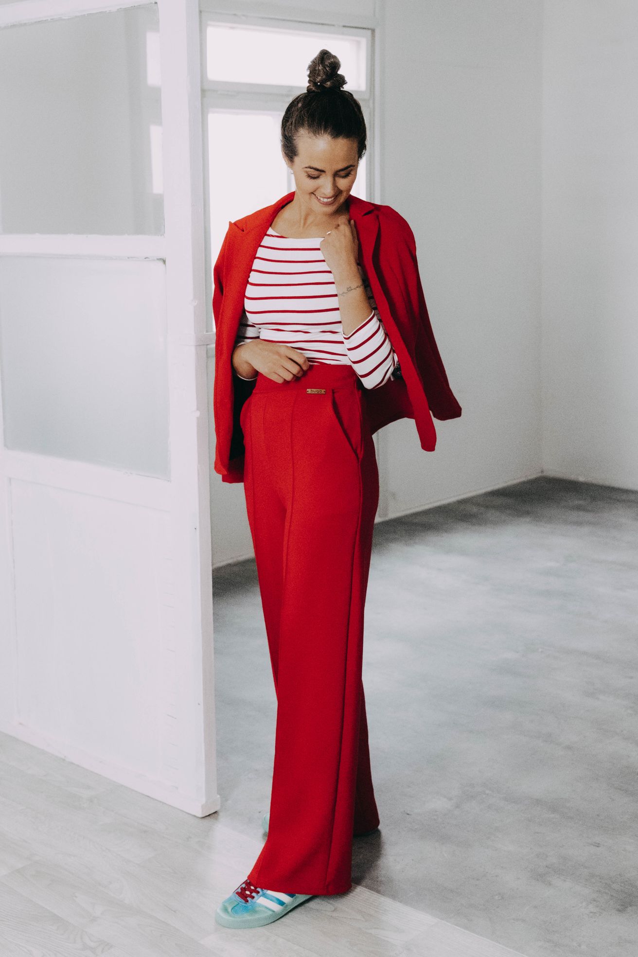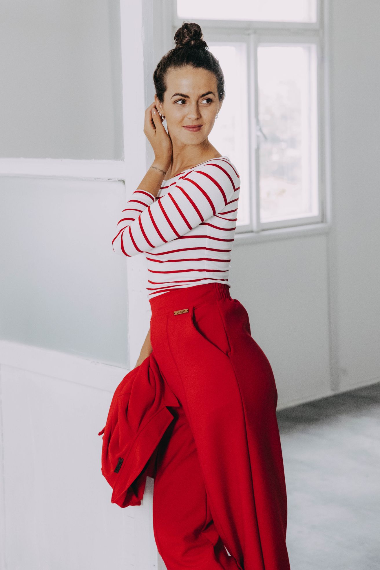 Královny šetřit nemusí, a to ani na barvách. Červený outfit s prvky sportovní elegance jasně prozrazuje, jakým sebevědomím žena oplývá, když zvolí takto nepřehlédnutelnou kombinaci. Široké nohavice kalhot Malika, nadčasový střih sáčka Chanya a suverénní proužky na tričku Gogo Elegance o vás řeknou vše. Tedy… téměř vše.