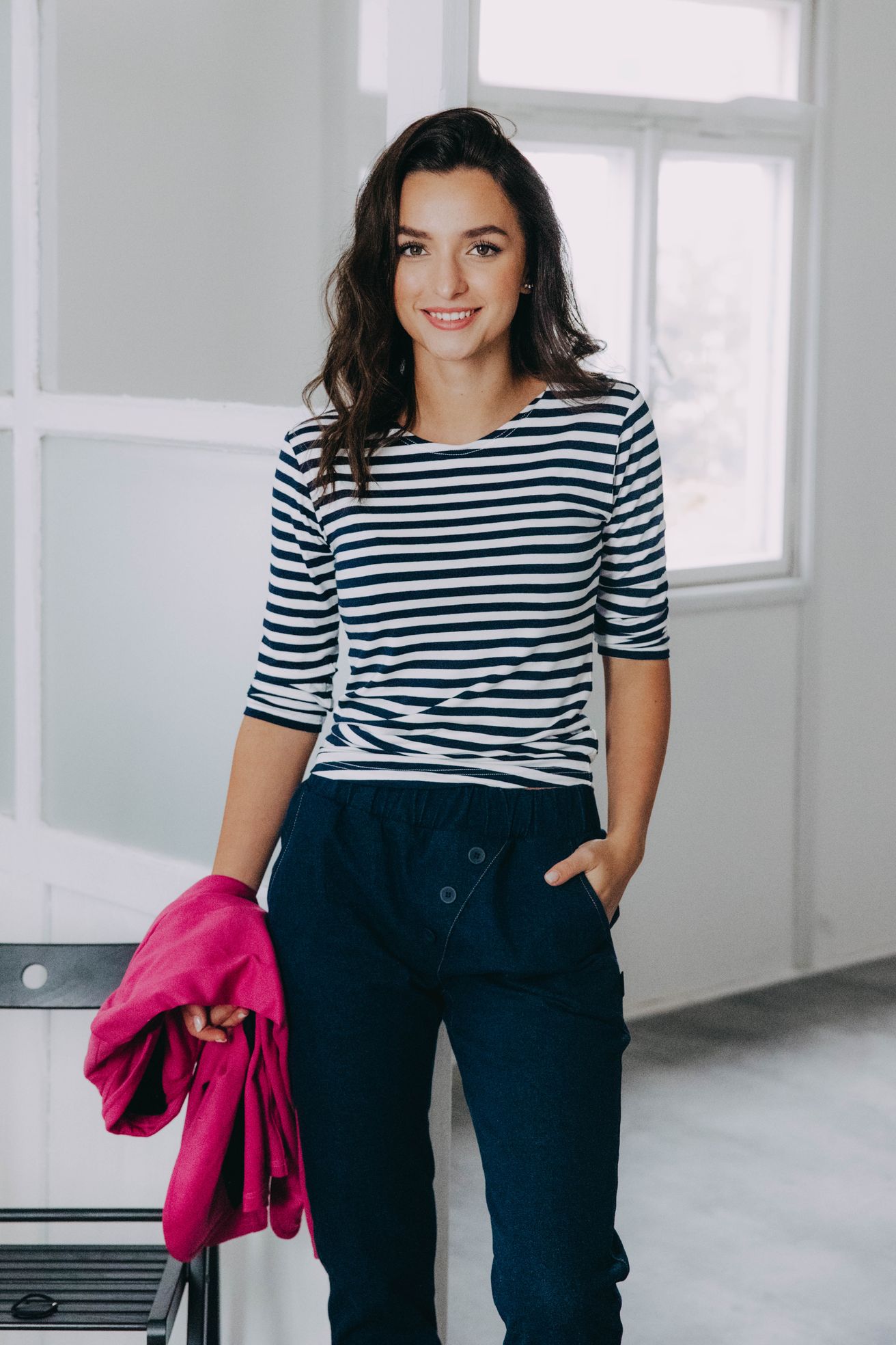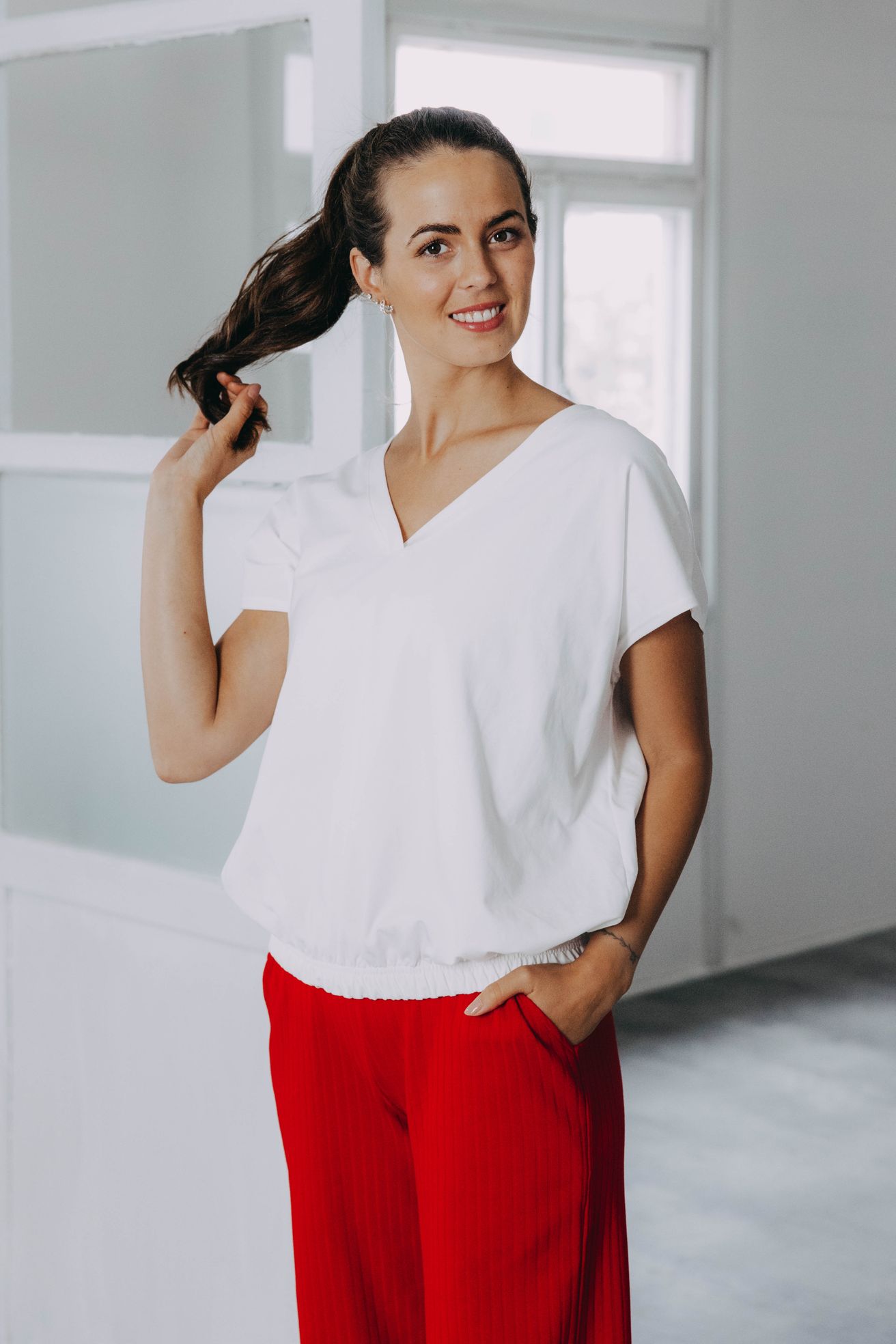 Model, který na pracovní schůzce zaručí, že vám všichni všechno odkývou. Suverénní rudé kalhoty Nakato mají elegantní vroubkovanou texturu a díky širším nohavicím skvěle prodlužují postavu. A co takhle dát projednou vale všem košilím a nahradit je ležérním apartním topem Gari s véčkovým výstřihem a spadlými rukávy? Nadčasové černé sáčko Ania spolu s praktickou kabelkou pak businessový look krásně doladí.