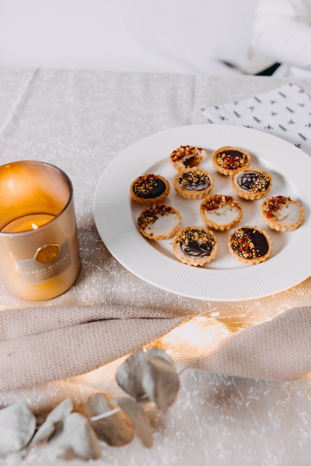 1) Začínám sypkými ingrediencemi – do misky dám mouku, cukr, špetku soli a zamíchám. Pak přidám citronovou kůru, žloutky, máslo a začnu vypracovávat těsto. To zpracovávám tak dlouho, dokud není hladké. Pak ho zabalím do potravinové fólie a dám ho odpočívat minimálně na hodinu do lednice (můžeme nechat klidně do druhého dne). 2) Mezitím co těsto odpočívá, si nachystám slaný karamel. V hrnci nechám rozehřát krupicový cukr a za stálého míchání ho zahřívám tak dlouho, až chytne krásnou bronzovou barvu. Dejte si pozor, ať ho nespálíte. Pak si v jiném hrnci ohřeju máslo a smetanu a opatrně je přiliju do horkého karamelu. Určitě nezapomeňte na špetku soli, bez té to není ono! 3) Teď je na řadě těsto. To nechám po vyndání z ledničky chvilku „rozkoukat“ (ne moc dlouho, stačí, aby trochu povolilo :)) a pak ho rozválím na přibližně 2–3 mm silnou placku. Z té pak vykrajuju kolečka, která pak natlačím do formiček. Nakonec udělám na dno pomocí vidličky dírky, aby mělo kudy odcházet teplo. Povedlo se? Tak šup s nimi do trouby a péct, dokud nebudou okraje růžové. 4) Jakmile jsou košíčky hotové, nechám je vychladnout a naplním je troškou slaného karamelu. Když karamel ztuhne, přidám ganache z čokolády a horké smetany, kterou jsem si připravila v mezičase, dozdobím sekanými oříšky, nebo čím je líbo, a jííííím. |
