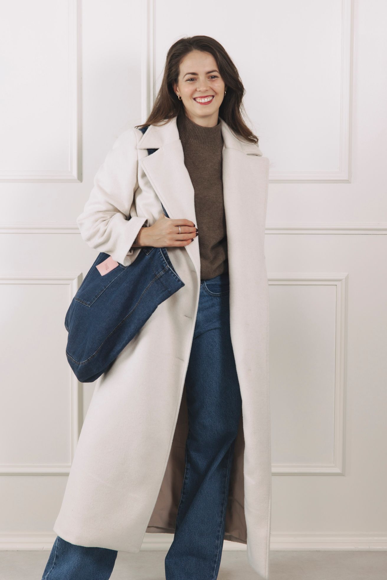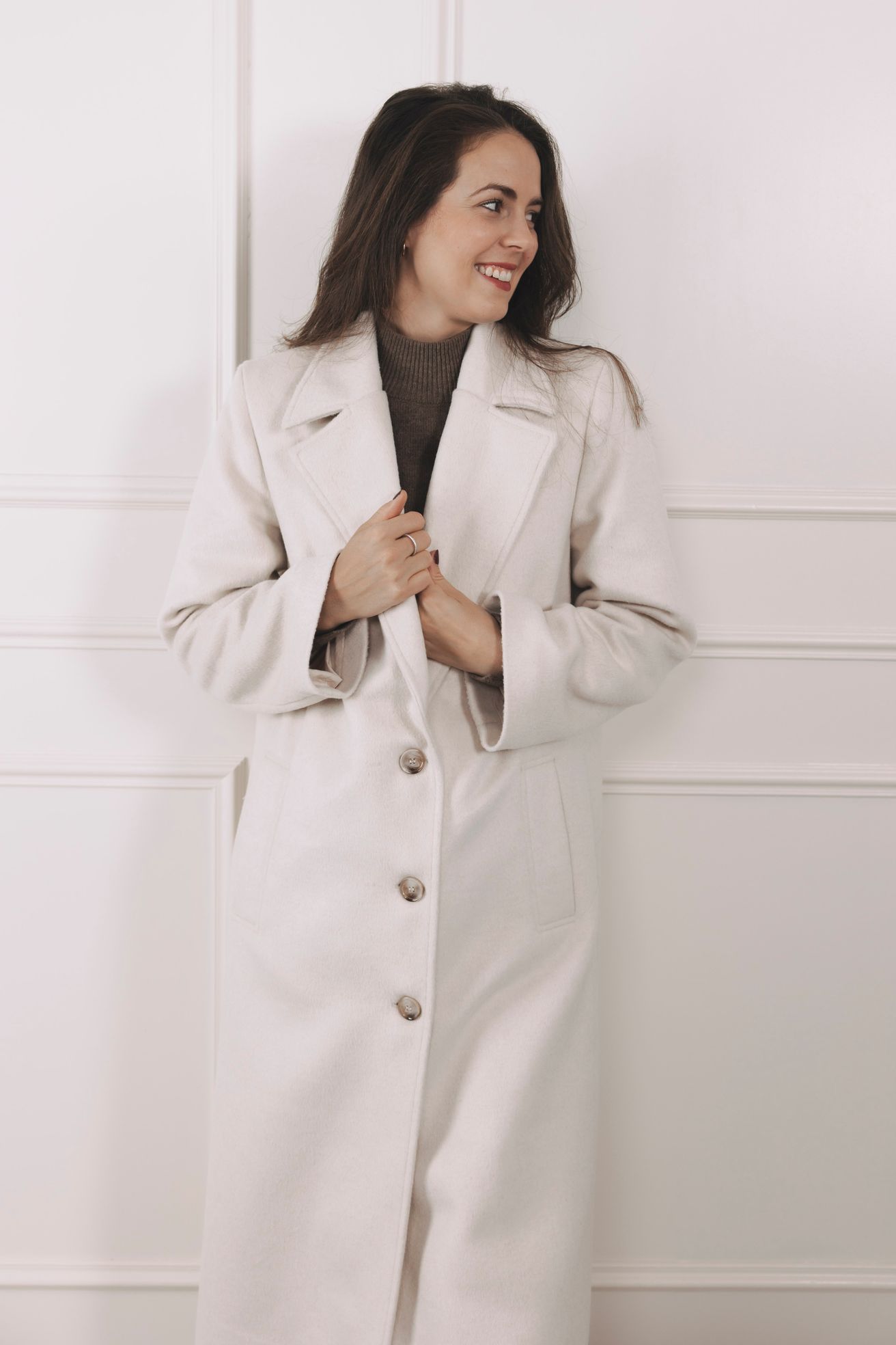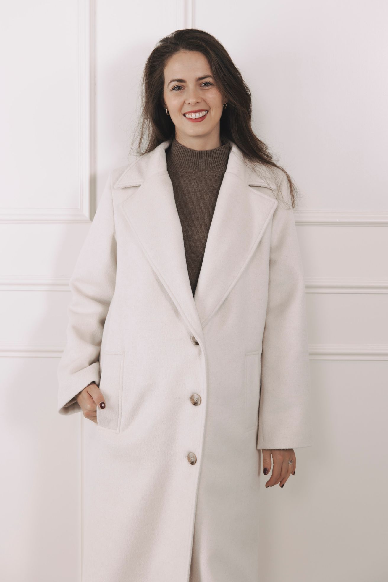 - Střih: Dlouhý kabát rovného, mírně oversized střihu s elegantními širokými klopami. Délka až ke kotníkům opticky prodlouží siluetu.