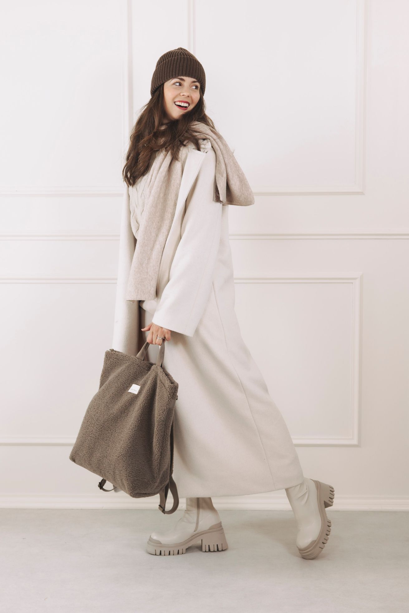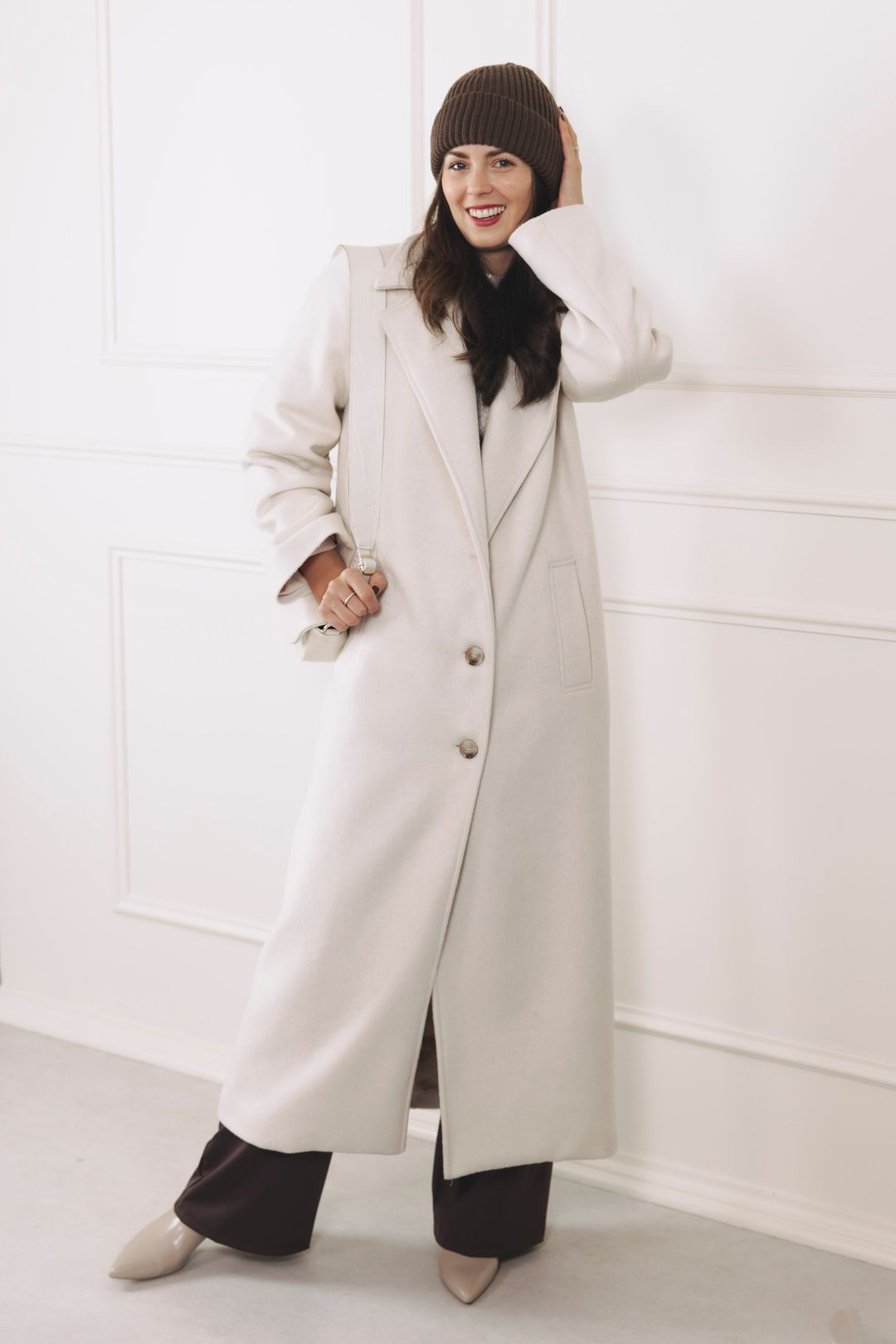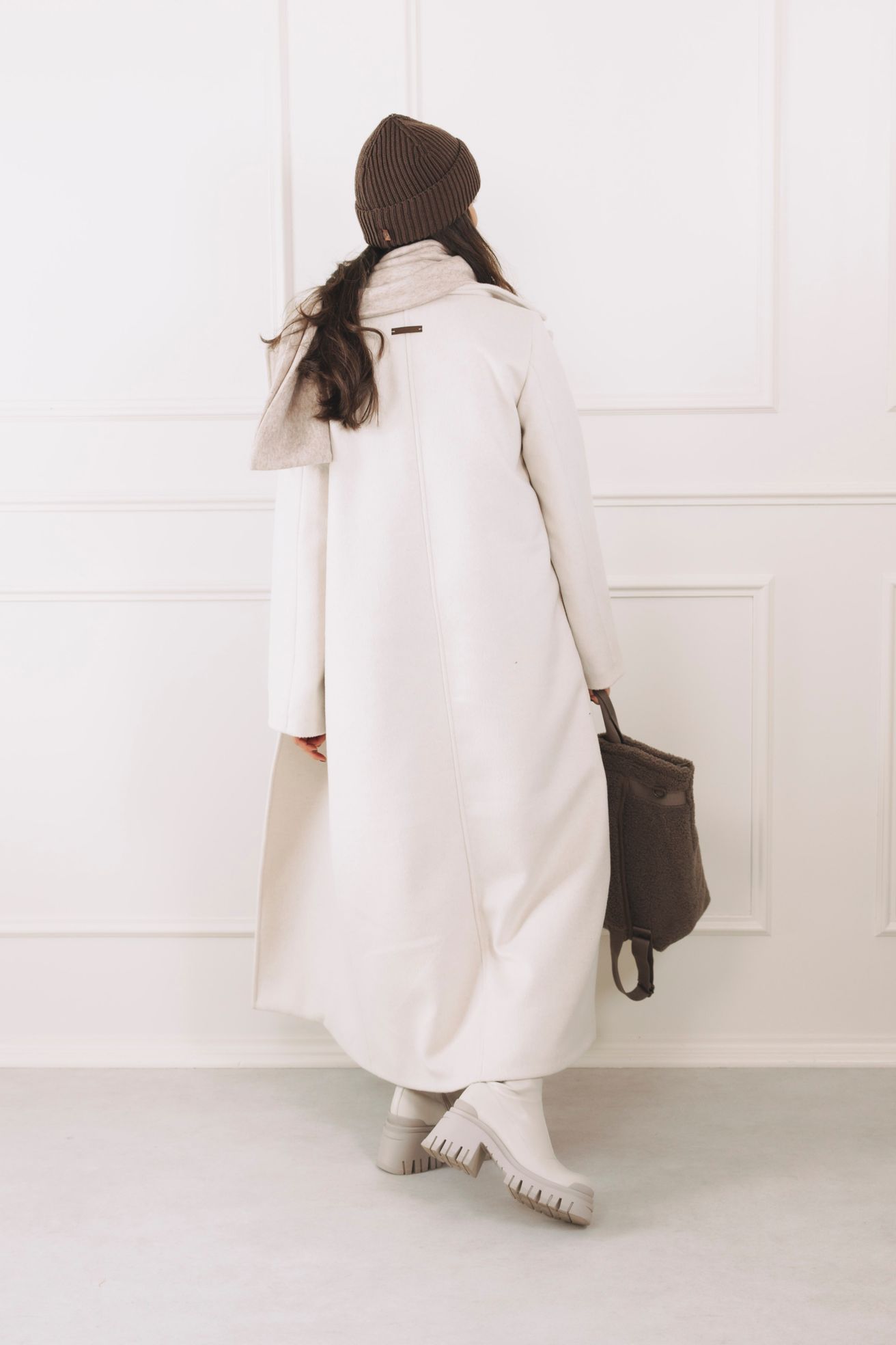 - Střih: Dlouhý kabát rovného, mírně oversized střihu s elegantními širokými klopami. Délka až ke kotníkům opticky prodlouží siluetu.