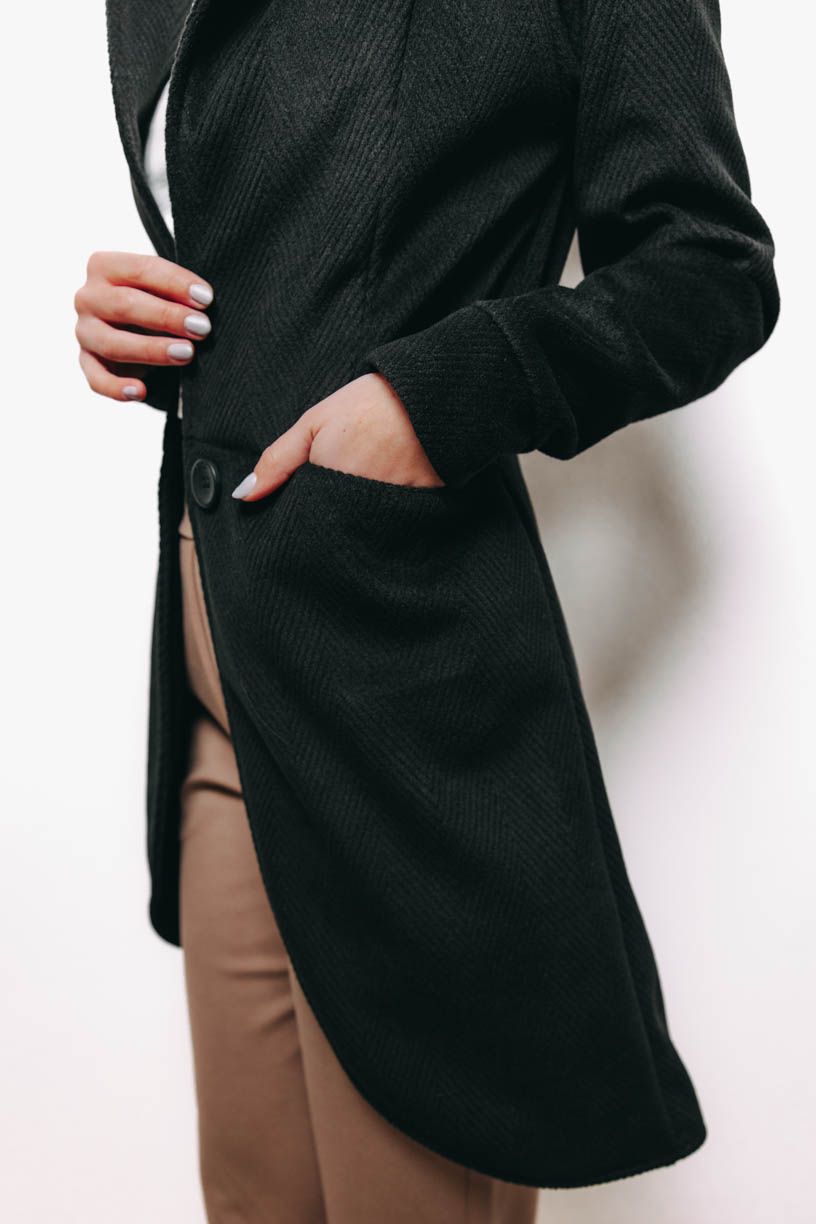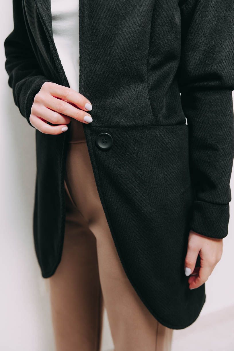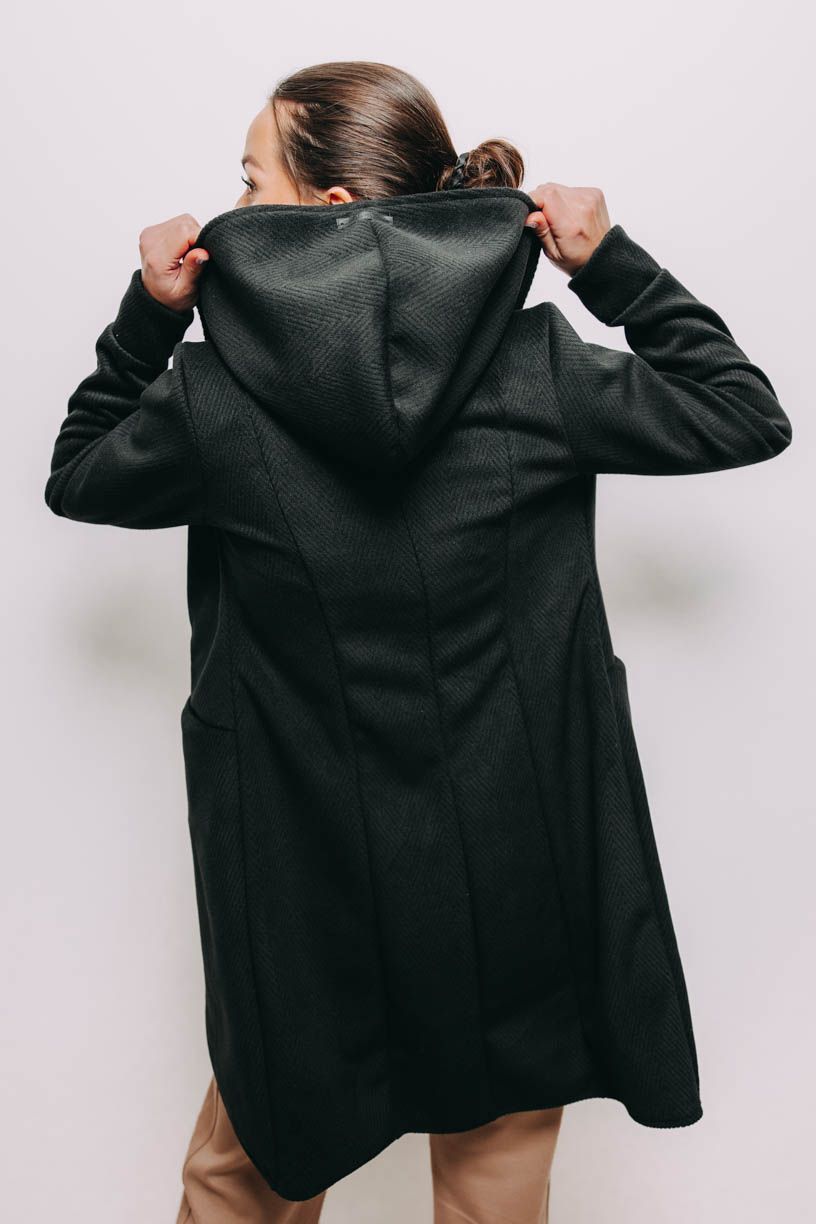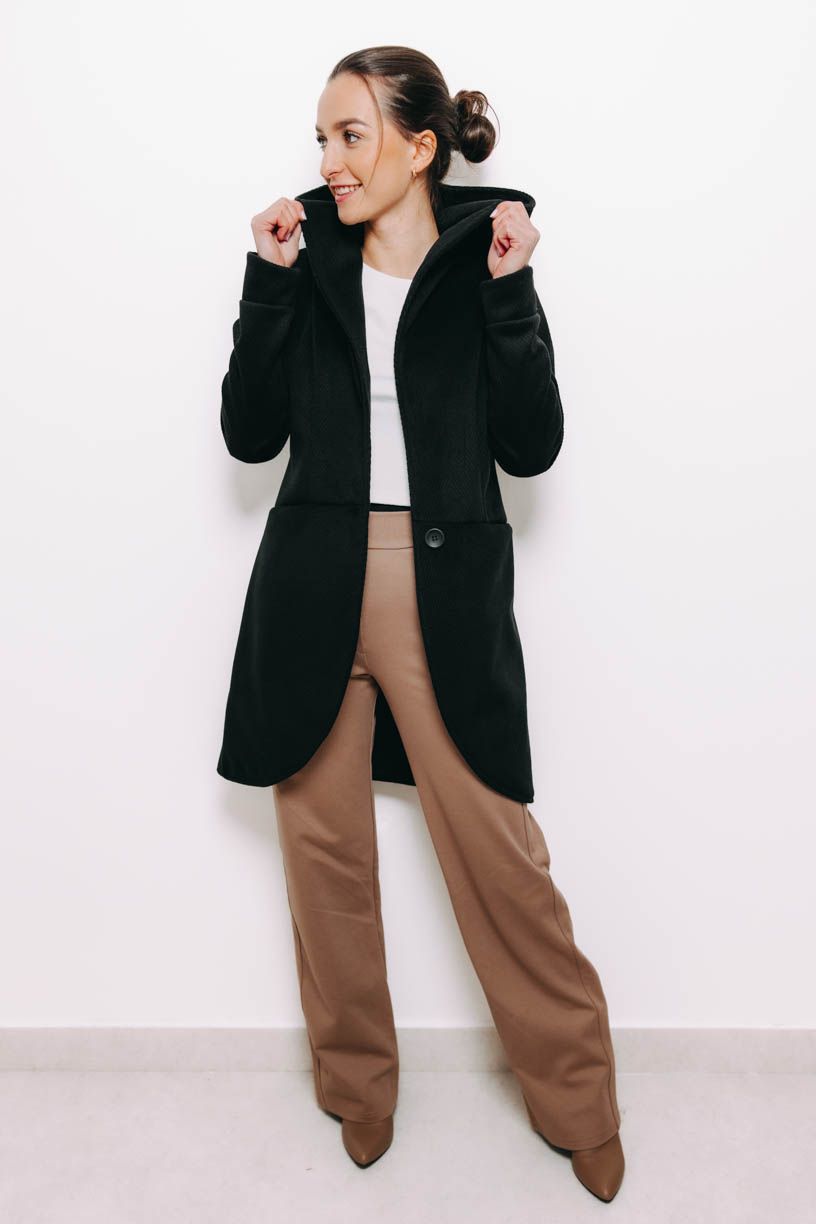 Hravou, ale decentní kapuci přehodíte přes lokny, když zrovna foukne, ruce a pár drobností schováte do šikovně skrytých kapes. Krásně ženský střih podtrhne vaši siluetu a černá barva je natolik univerzální, že kabátek vynosíte jak ve stylu kapsulovém, tak s celou řadou vašich oblíbených barev.