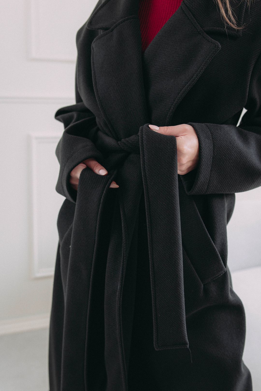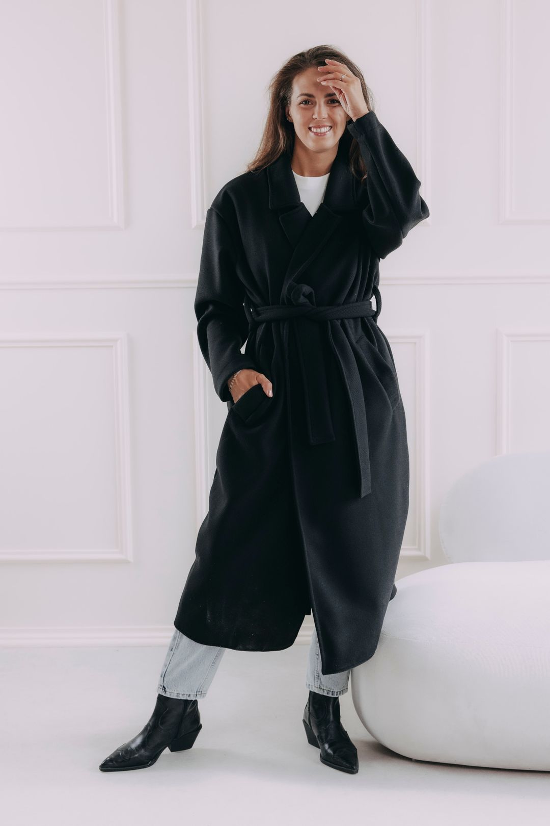 Představte si páteční odpoledne. Dveře kanceláře se zavřou a kabát Sumu Black s vámi plynule přechází z pracovního režimu do volného večera. S každým krokem se v něm cítíte uvolněněji. Ať už vás čeká nějaká povinnost typu víkendového nákupu, nebo čistá radost, jako když si po cestě pro kafe tajně skočíte na dortík, tenhle nadčasový černý kabát si s vašimi plány hravě poradí. Zvládne s vámi podzimní procházky i zimní plískanice, aniž byste se musela vzdát elegance. Jeden dlouhý kabát s páskem, nekonečno možností.