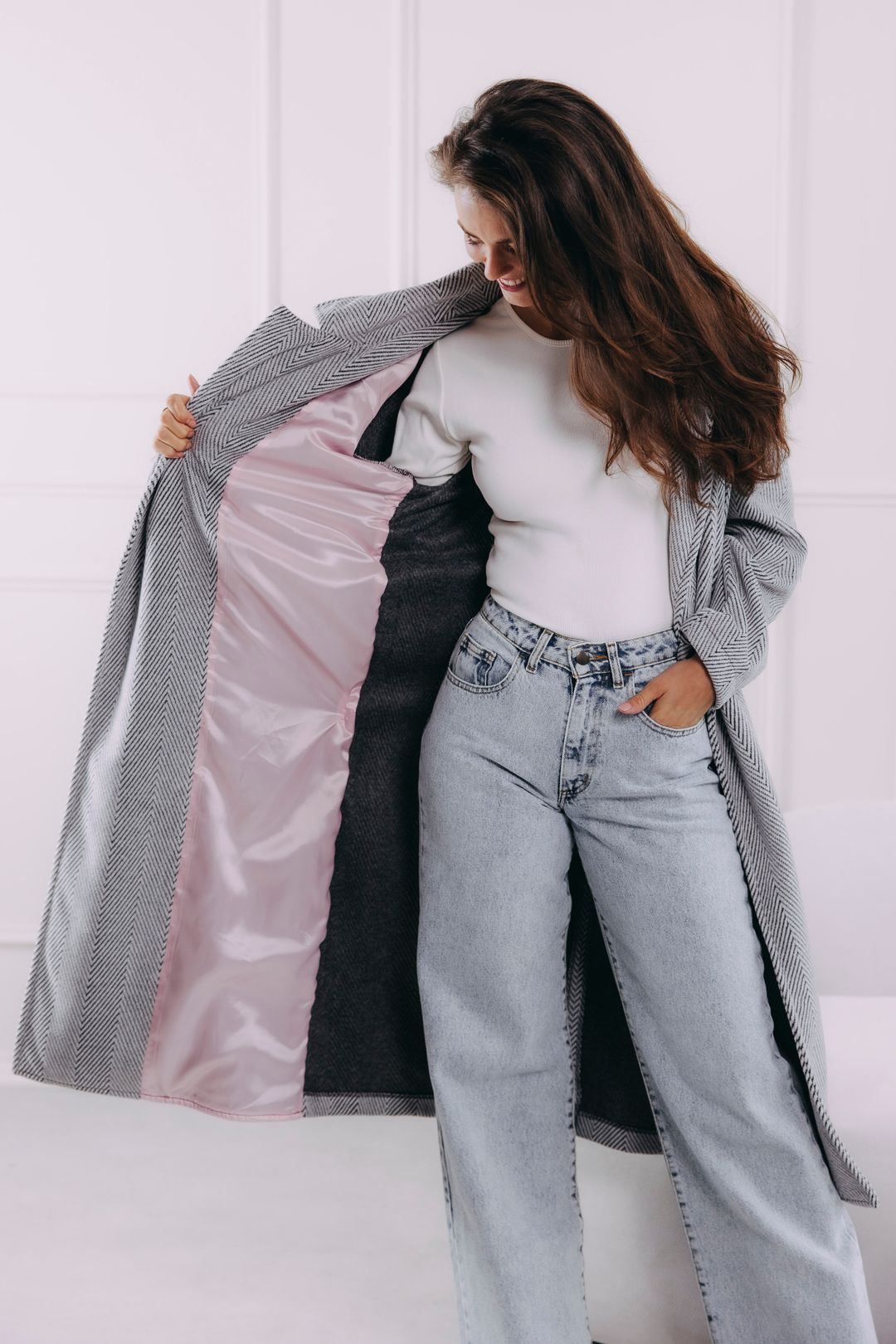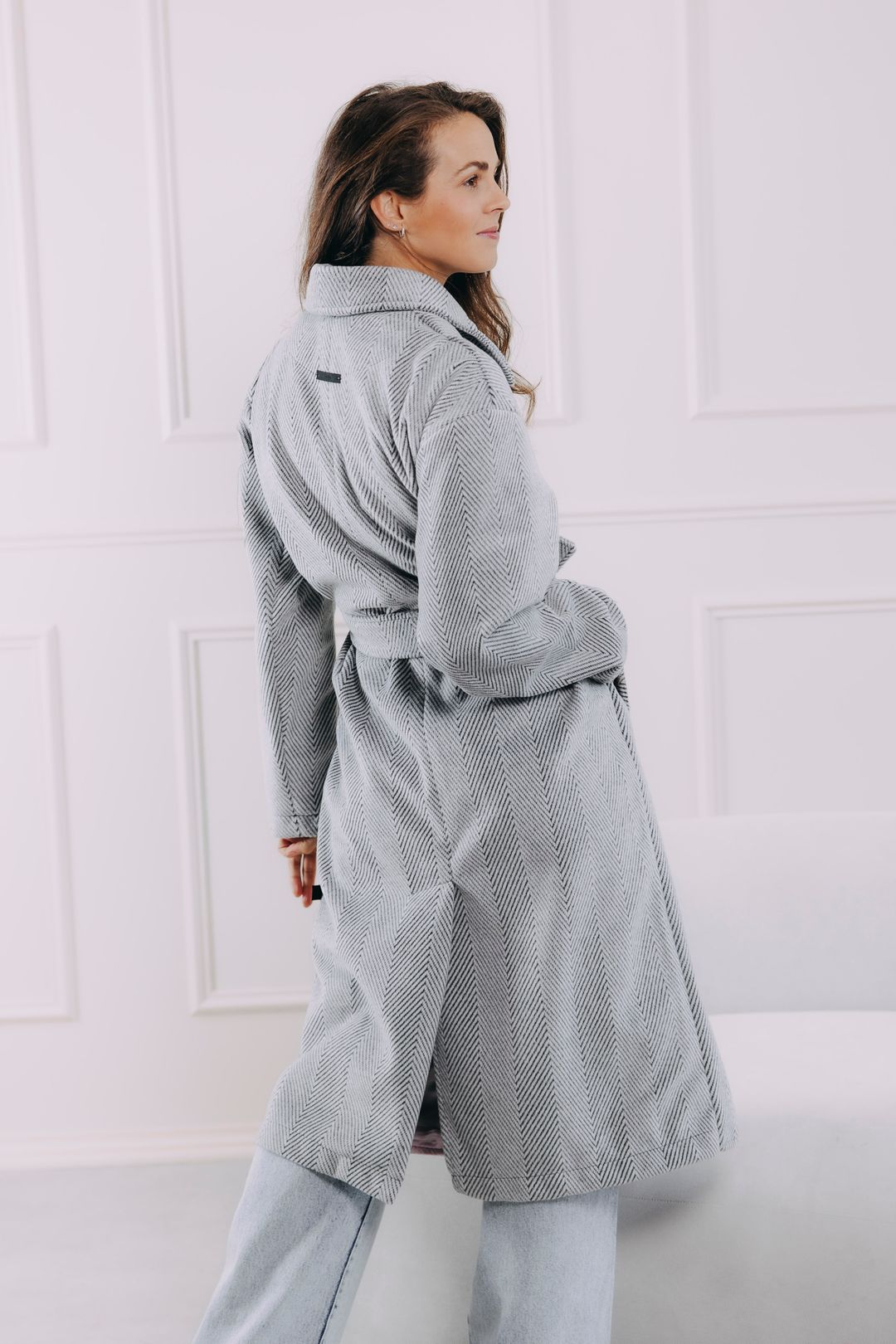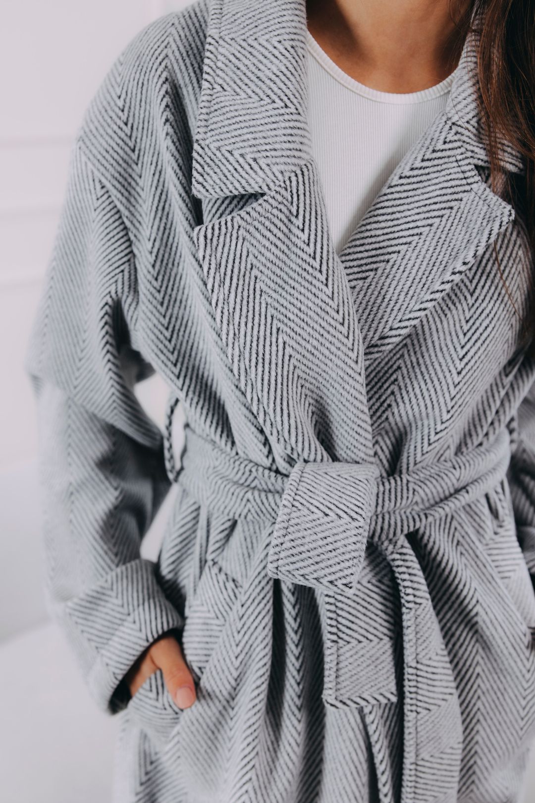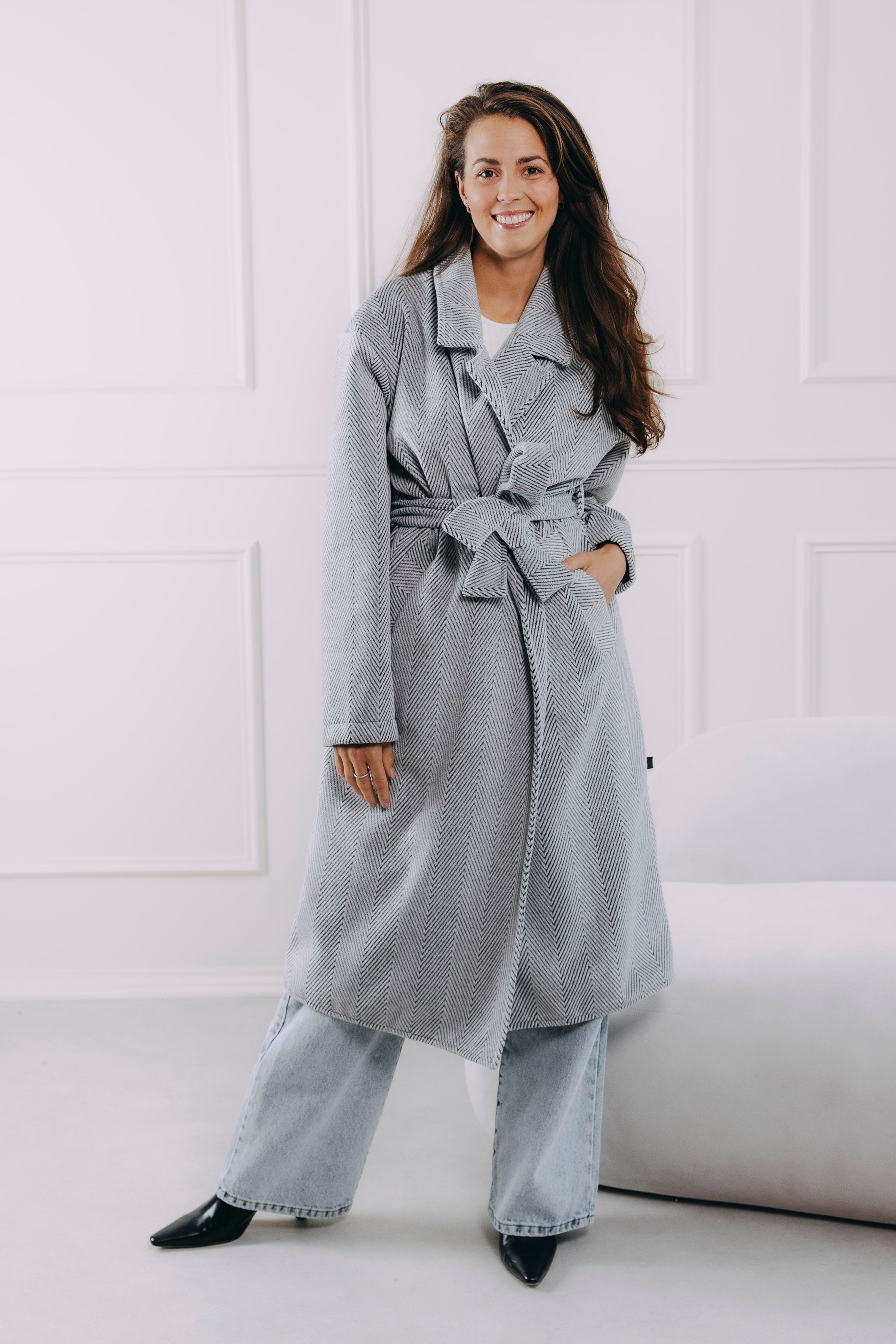 Představte si páteční odpoledne. Dveře kanceláře se zavřou a kabát Sumu Chevron s vámi plynule přechází z pracovního režimu do volného večera. S každým krokem se v něm cítíte uvolněněji. Ať už vás čeká nějaká povinnost typu víkendového nákupu, nebo čistá radost, jako když si po cestě pro kafe tajně skočíte na dortík, tenhle nadčasový kabát si s vašimi plány hravě poradí. Zvládne s vámi podzimní procházky i zimní plískanice, aniž byste se musela vzdát elegance. Jeden dlouhý kabát s páskem, nekonečno možností.