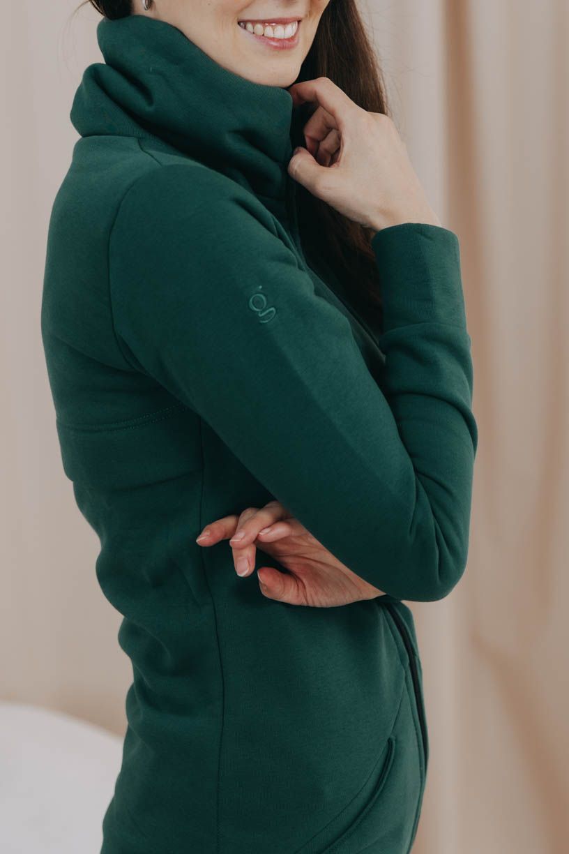 Tmavě zelený mikinový kabátek na zip Dada je celoroční kousek, který využijete jako svrchní vrstvu, i jako hřejivý základ pod dlouhou bundu či vestu.