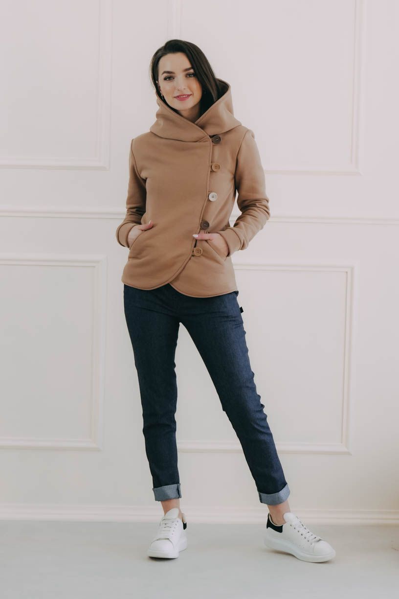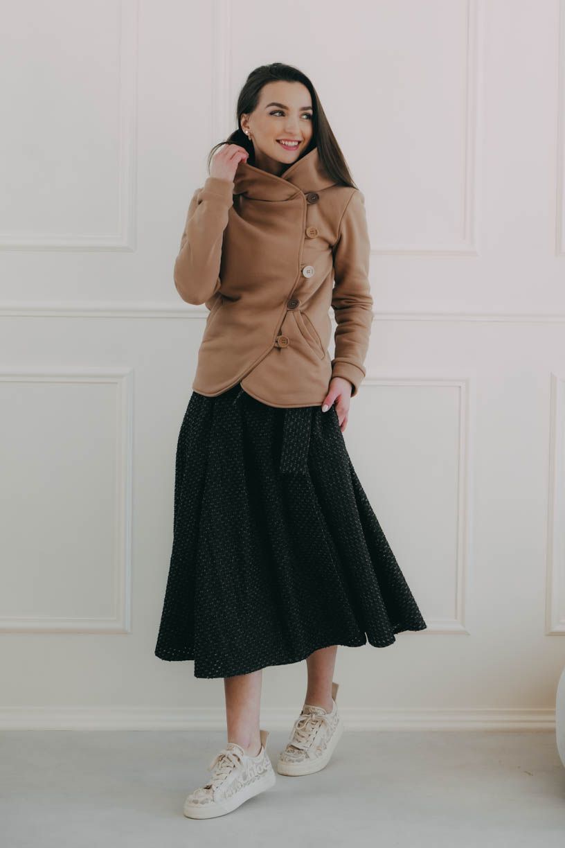 Ušili jsme ho na vaše přání tentokrát z bavlny s příměsí polyesteru, která zahřeje v chladných jarních dnech a zároveň vám dodá elegantní styl. Neutrální béžový odstín je nadčasový a dokonale zapadne do jakéhokoliv outfitu – skvěle se kombinuje s jemnými pastelovými tóny, ale i s kontrastní černou nebo karamelovou.