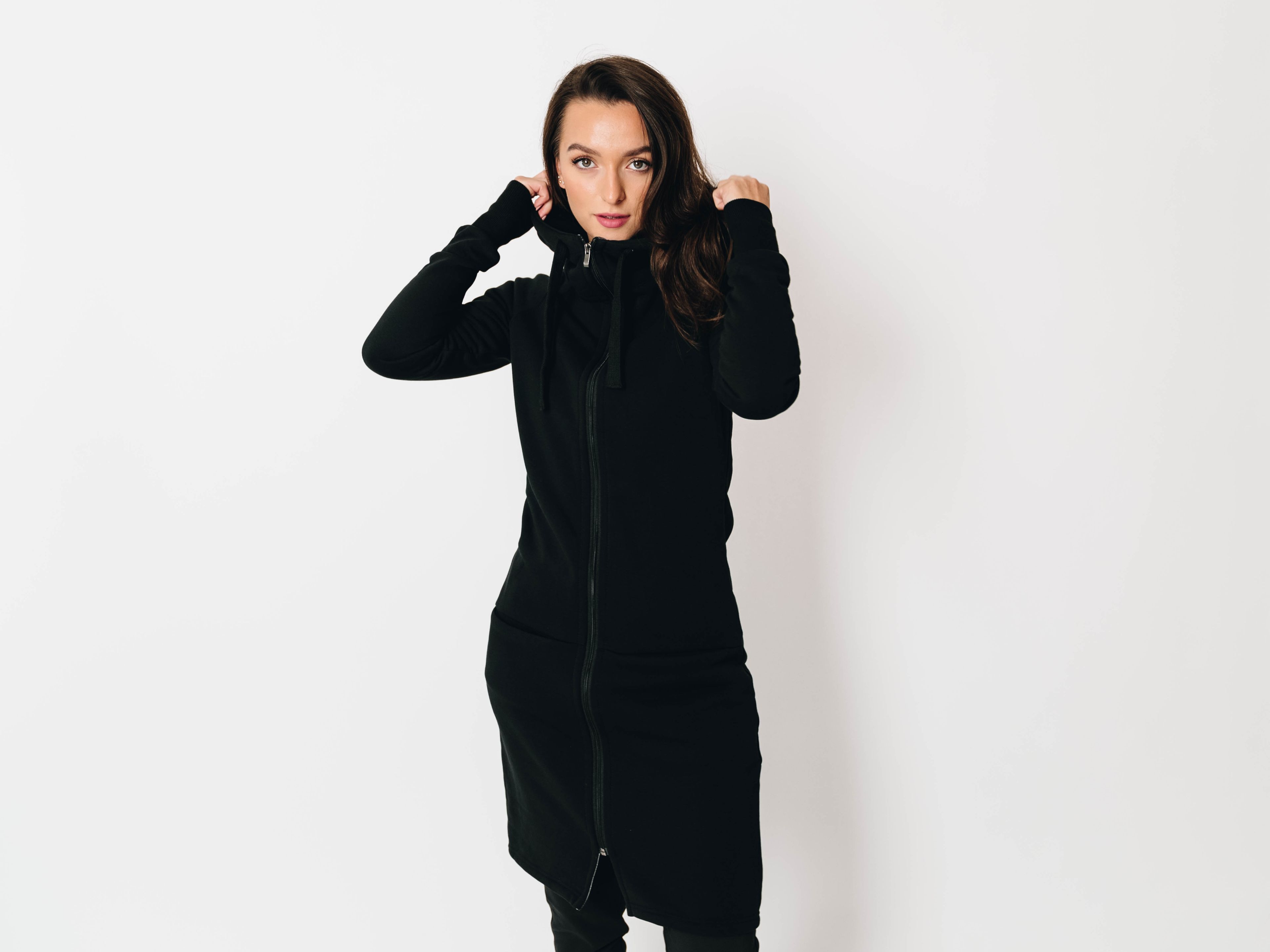 - Design a detaily:Lerato je dlouhý mikinový kabátek se zapínáním na zip po celé délce a velkou praktickou kapucí. Raglánové rukávy jsou zakončené dvojitým nápletem, který skvěle vypadá a navíc udrží vaše ruce v teple.