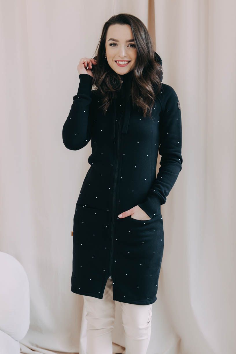 - Design a detaily:Lerato je dlouhý mikinový kabátek se zapínáním na zip po celé délce a velkou praktickou kapucí. Raglánové rukávy jsou zakončené dvojitým nápletem, který skvěle vypadá a navíc udrží vaše ruce v teple.