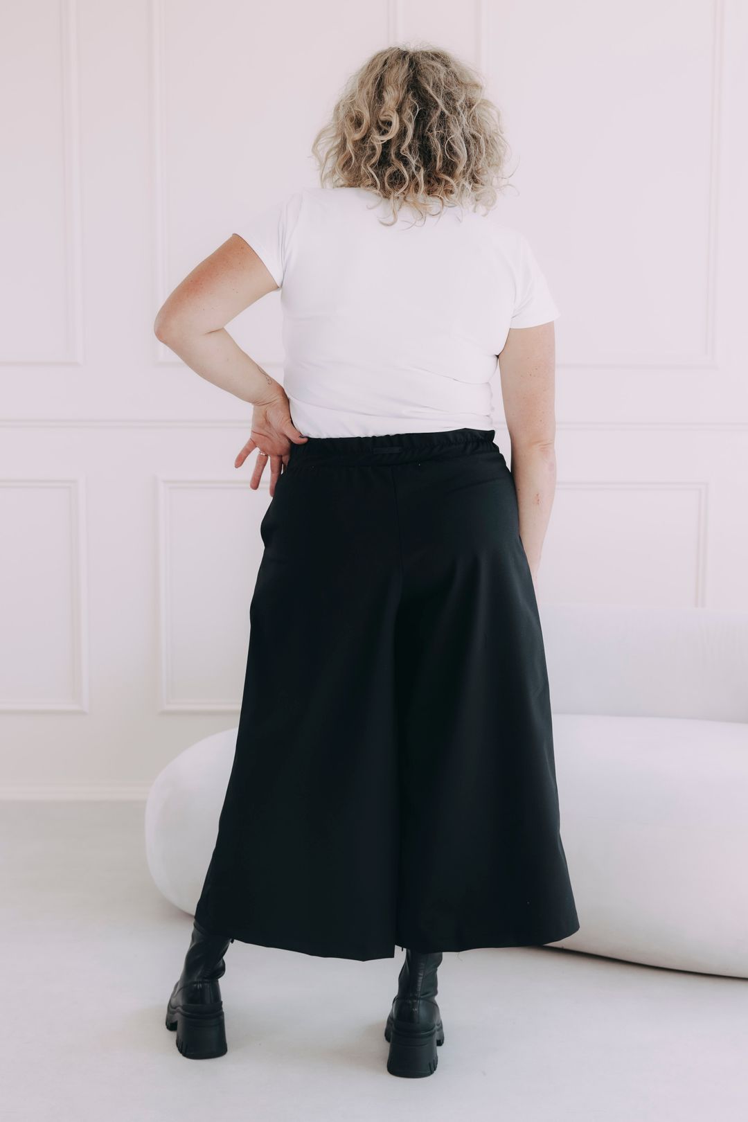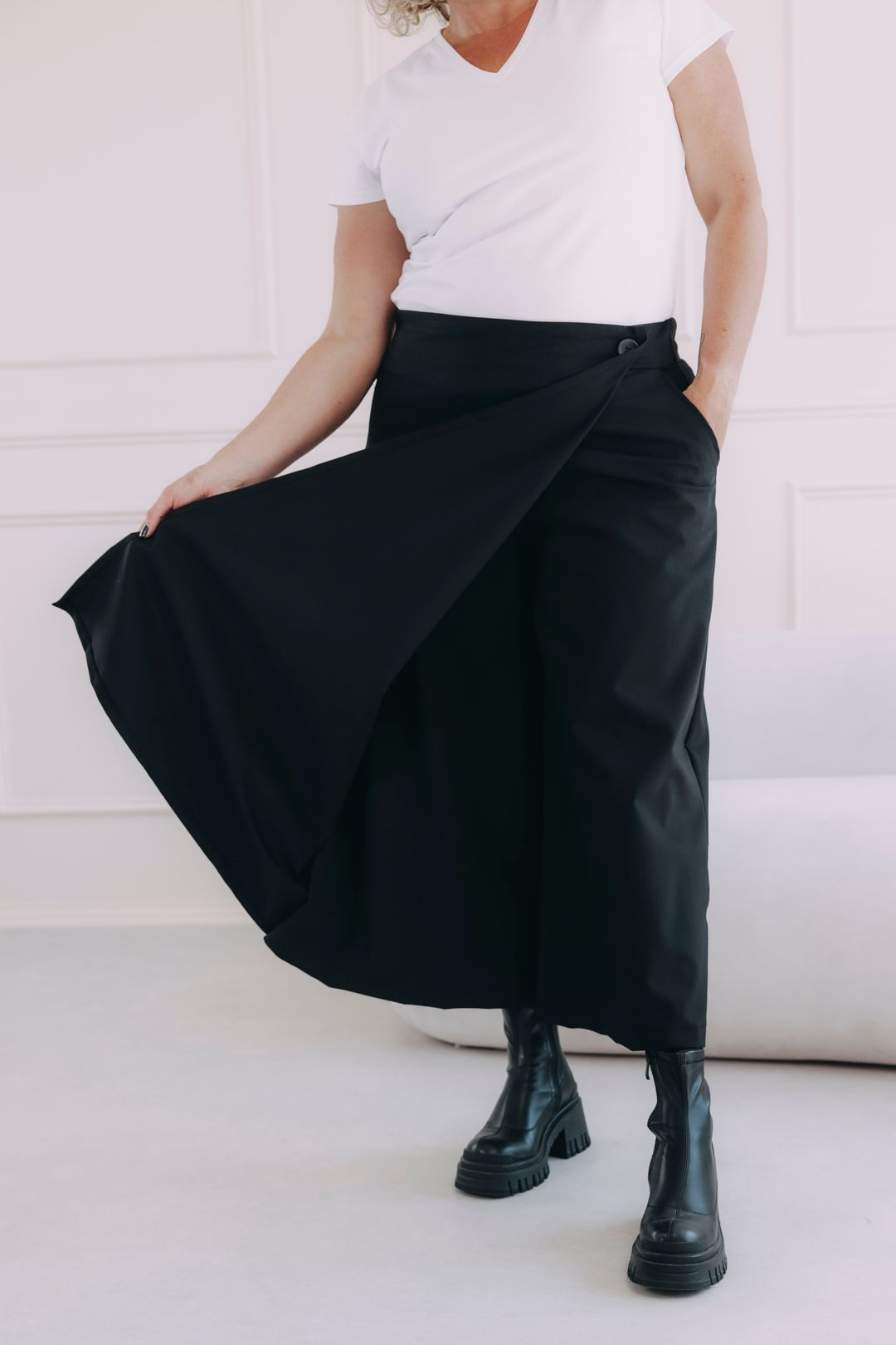 - Střih: Široké nohavice díky přednímu překrytí vypadají jako sukně, ale v pohybu se promění ve šmrncovní kalhoty. Pohodlná guma v zadní části pasu se vám přizpůsobí na míru, a vy si tak užijete maximální komfort. A knoflíček? Ten je jenom na ozdobu.