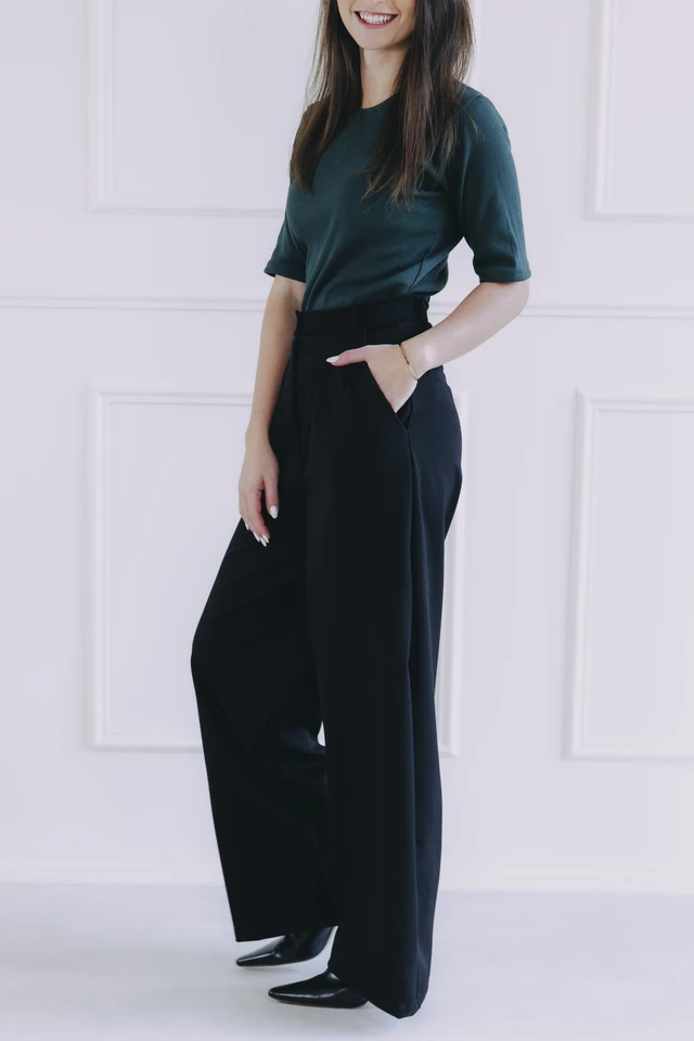 Kalhoty Amadu jsou univerzálně lichotivé. Vysoký pas opticky prodlužuje nohy, zatímco široké nohavice a sklady vyrovnávají siluetu, což je skvělé zejména pro postavy typu hruška a přesýpací hodiny.