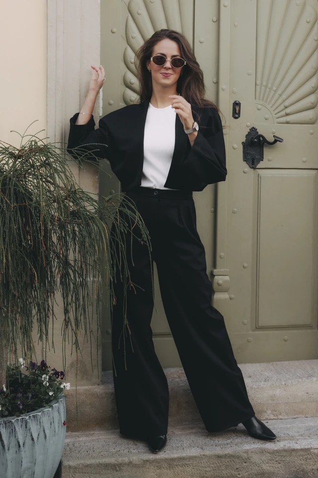 - Pro kontrast: Pokud nechcete monochromatický komplet, kalhotám Amadu neuvěřitelně sluší klasické delší sako v kontrastní světlé barvě. Vytvoříte tak kontrast, který je v byznys módě velmi trendy.