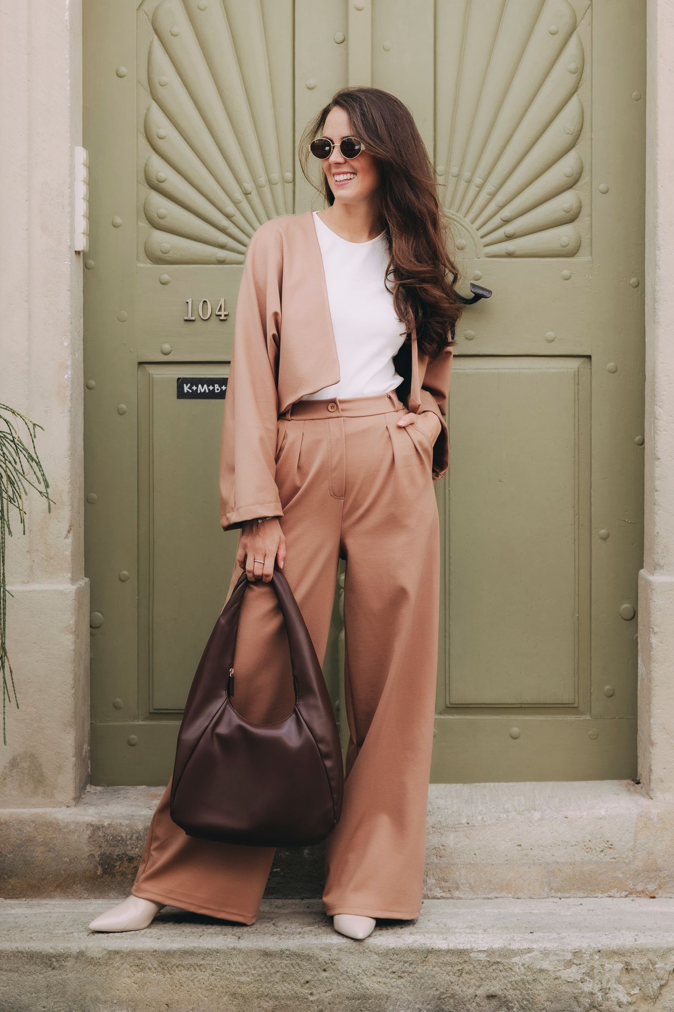 - Kompletní set: Zkombinujte kalhoty s blejzrem nebo sáčkem Amadu a pod něj oblečte světlý top, rolák nebo jednoduchou bílou košili. Obujte lodičky na podpatku a zvolte jemné zlaté náušnice.