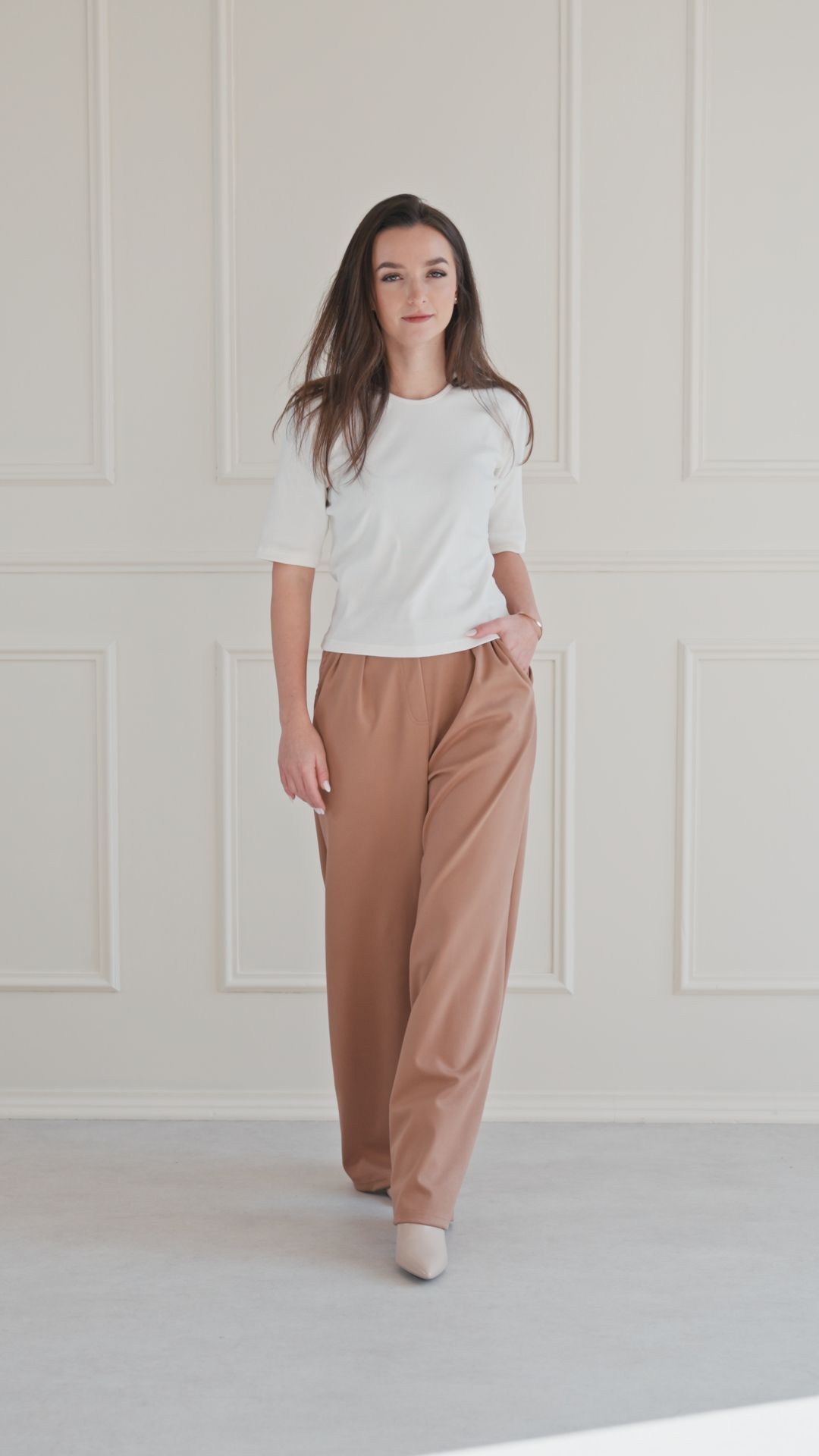 Kalhoty Amadu jsou univerzálně lichotivé. Vysoký pas opticky prodlužuje nohy, zatímco široké nohavice a sklady vyrovnávají siluetu, což je skvělé zejména pro postavy typu hruška a přesýpací hodiny.