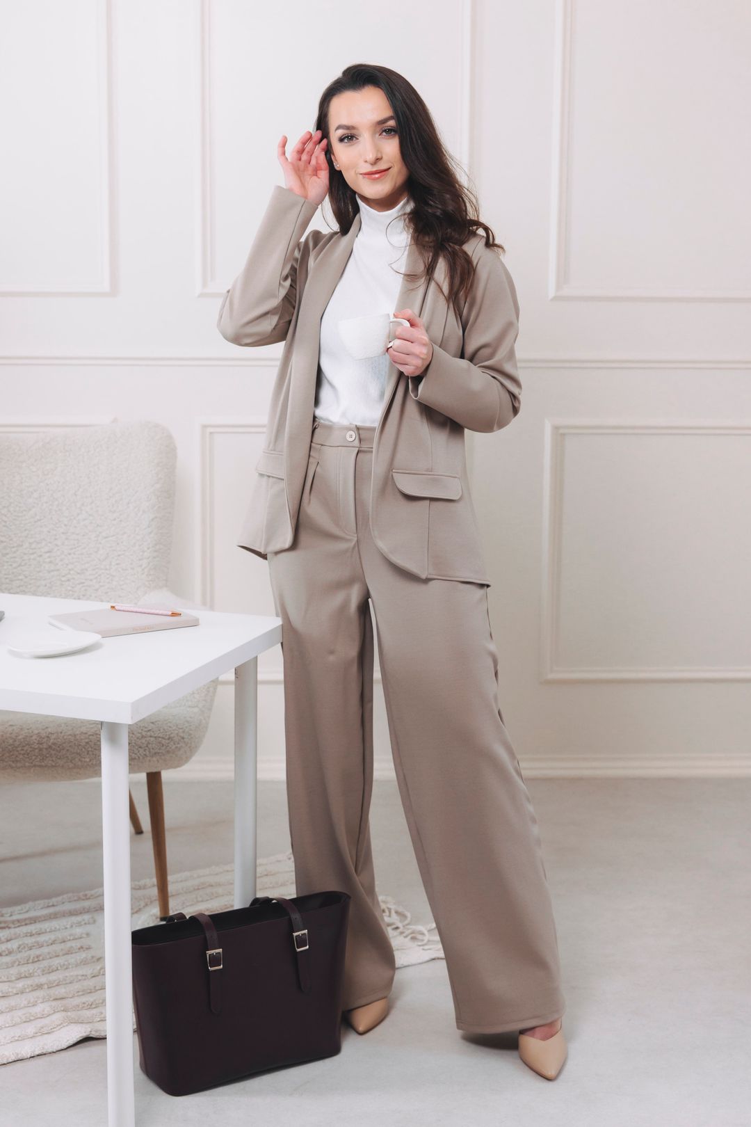 Kalhoty Amadu jsou univerzálně lichotivé. Vysoký pas opticky prodlužuje nohy, zatímco široké nohavice a sklady vyrovnávají siluetu, což je skvělé zejména pro postavy typu hruška a přesýpací hodiny.