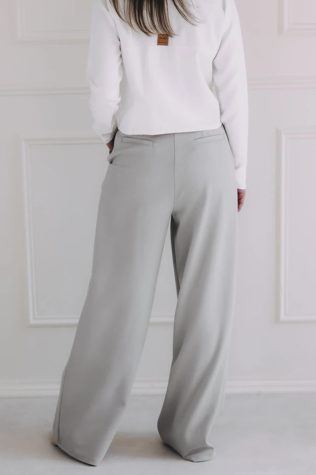 - Střih: Široké nohavice a vysoký pas se sklady v přední části. I když jsou pro nás typické kalhoty bez zapínání, tyto mají klasický zip a knoflík. Proč? Protože jsme chtěli, aby vám perfektně seděly na postavě a přitom se jednoduše oblékaly.
