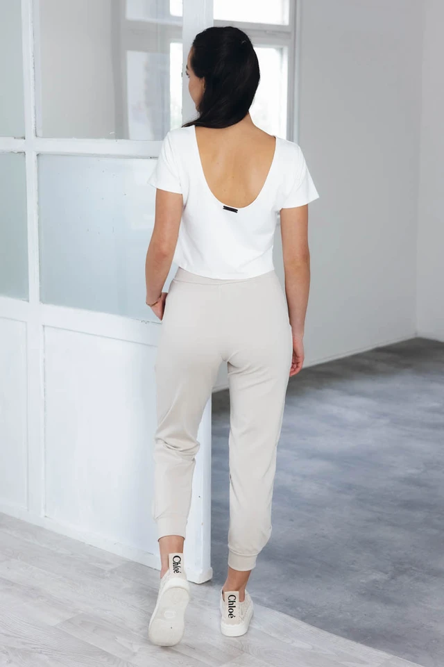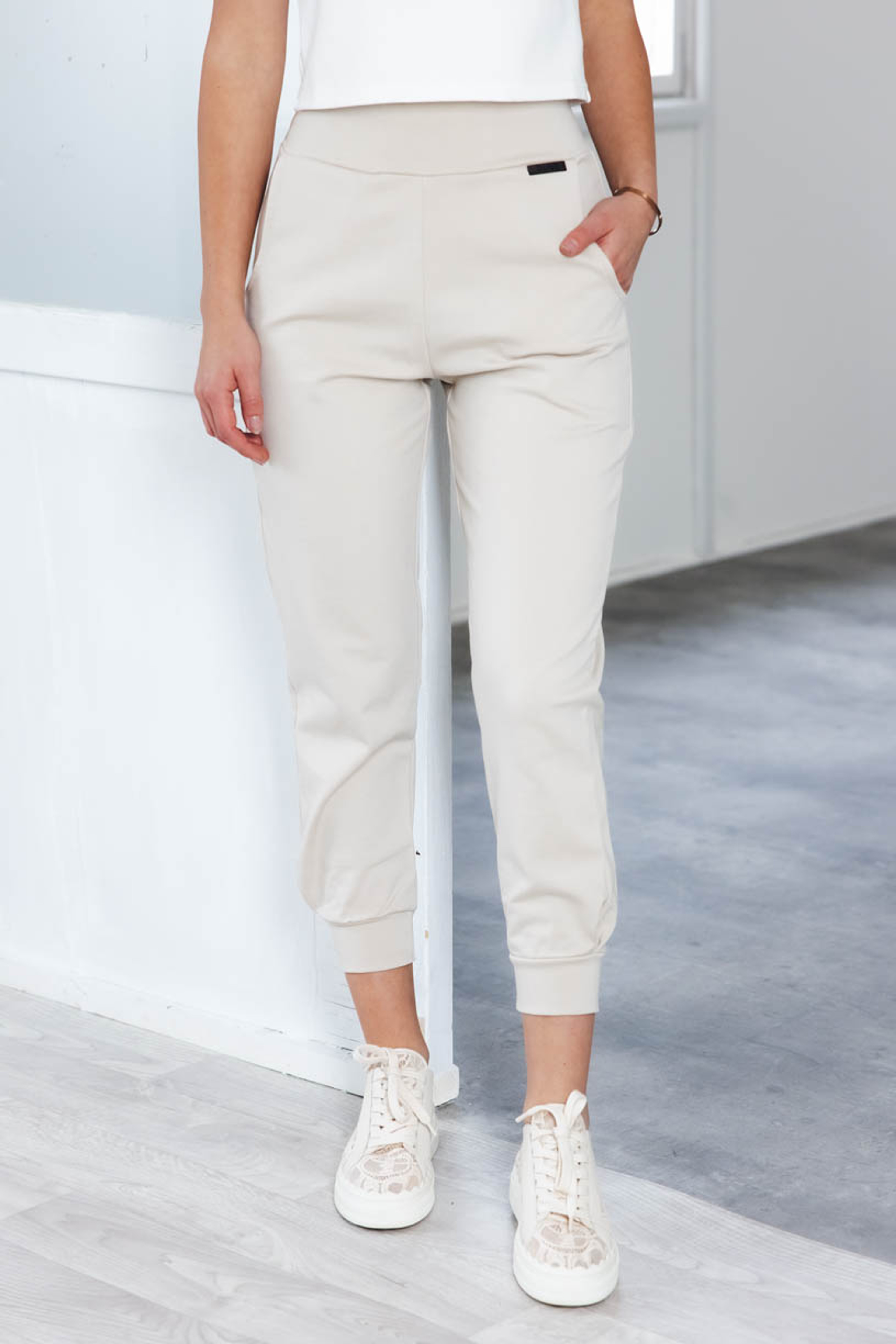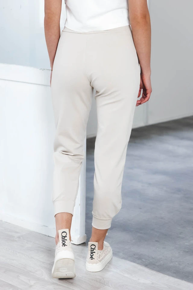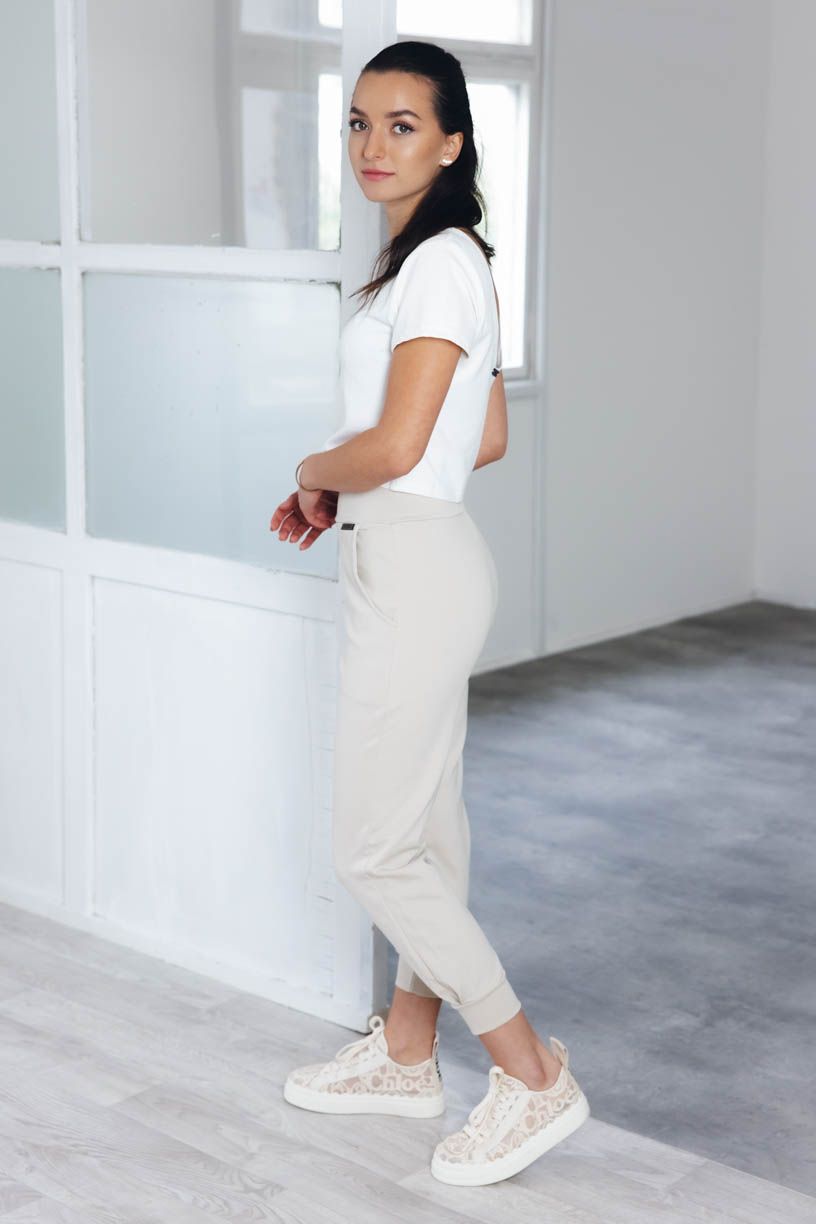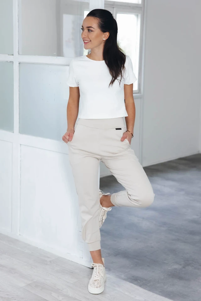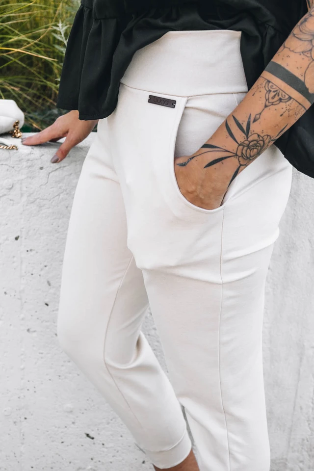 Při výběru materiálu jsme tentokrát sáhli po certifikované GOTS bavlně s vysokou gramáží s malou příměsí elastanu. Kalhoty nikde netlačí, nevytahují se a ani nemačkají, takže vám odpadne starost s žehlením.