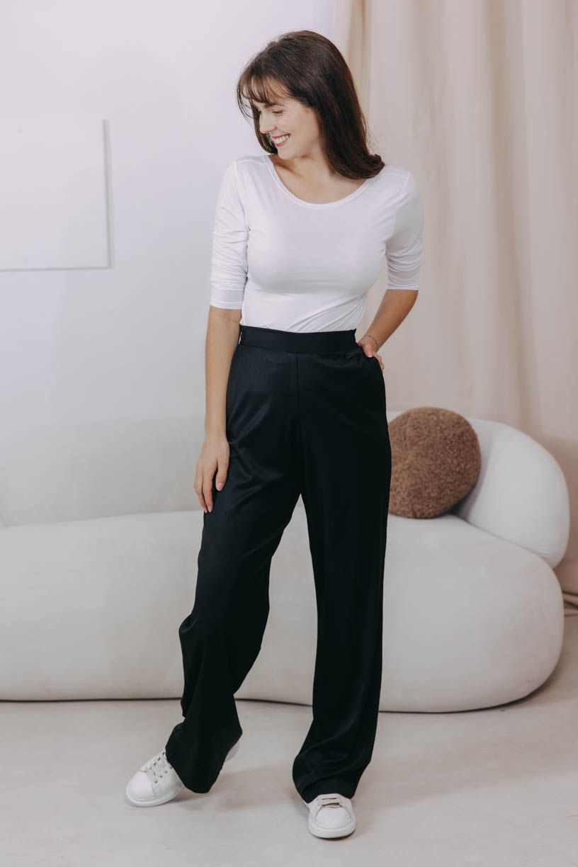 Tyto kalhoty jsou tak jemné, že když se jich dotknete se zavřenýma očima, dáte ruku do ohně za to, že to prostě musí být satén. Ve skutečnosti jsme Bijali Black ušili z chladivé viskózy s malým množstvím elastanu. V pase mají širokou gumu, která je vpředu hladká a na zádech řasená. Splývavé širší kalhoty zase oceníte v parných dnech, kdy se na stromě ani lístek nepohne.