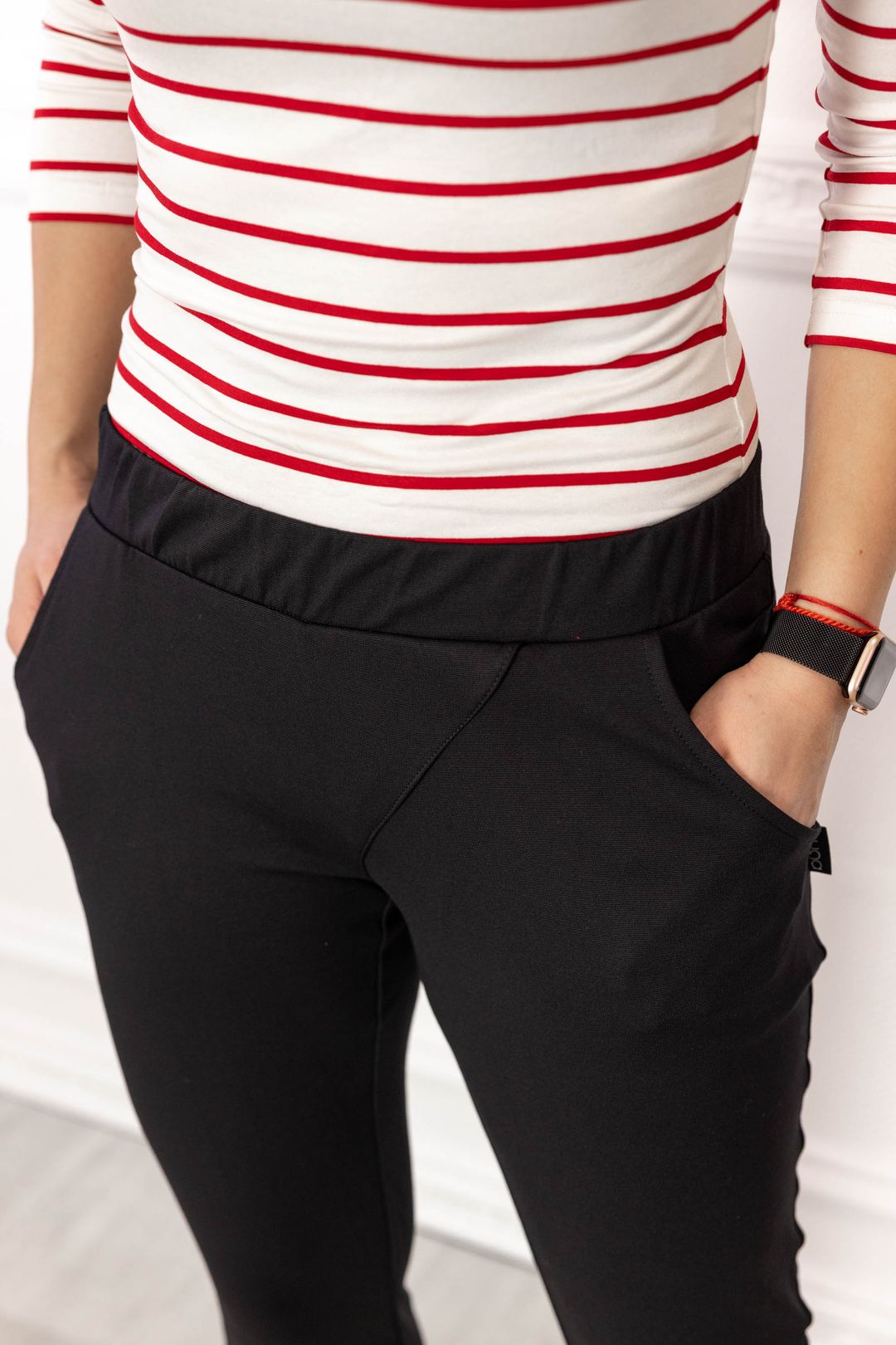 Šikovně řešený pas má všitou širokou gumu, která pěkně tvaruje každý typ postavy. Můžete si také pohrát se zastrčením topu nebo košile do kalhot, případně je nechat jen volně spuštěné.