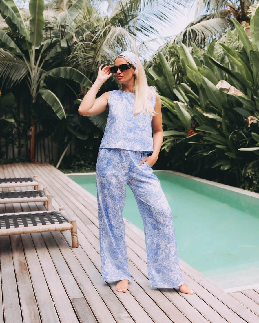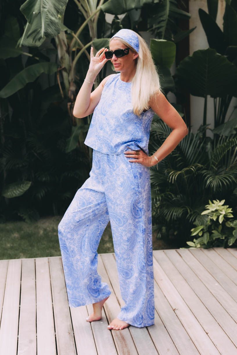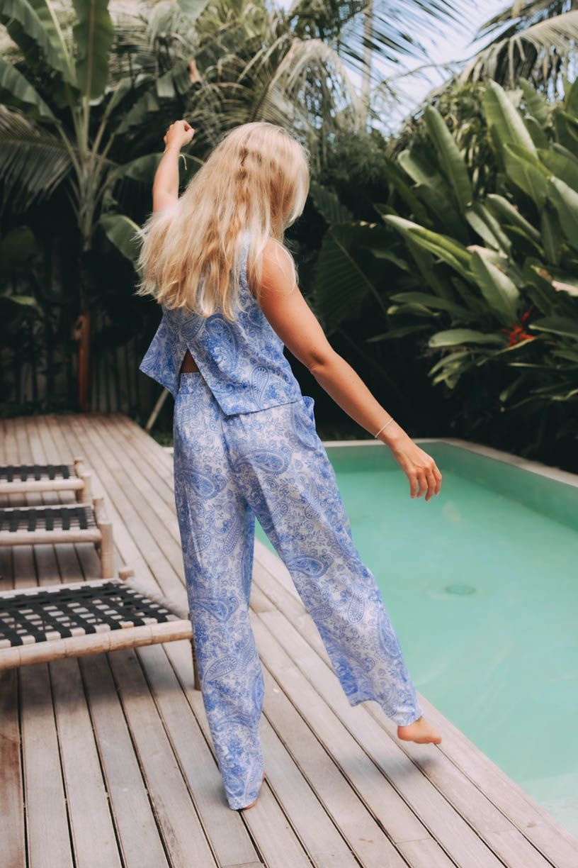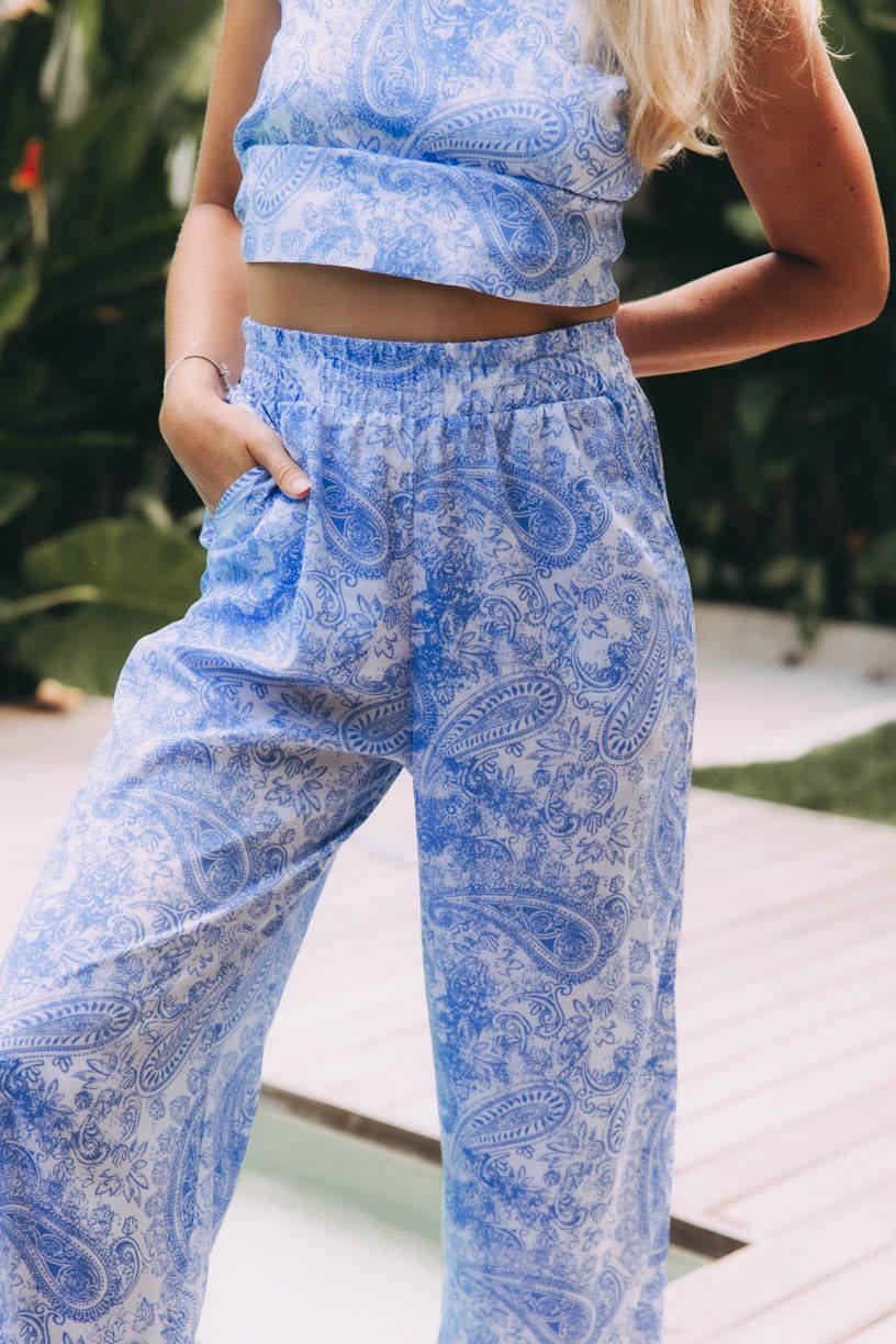Volné kalhoty Gede ze vzdušné viskózy obohatí váš letní šatník nejen netradičním orientálním paisley vzorem, ale i křehkou, modro-bílou kombinací barev.