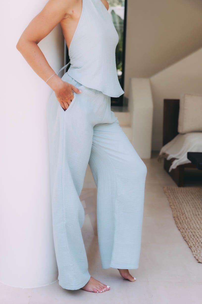 Široké, elegantní a přitom naprosto pohodlné. Kalhoty Gede v mintové barvě s vysokým pasem a širokou gumou oslavují volnost pohybu. Lehký a vzdušný mušelín je jako jemný dotek na pokožce – příjemný, měkký a ideální na teplé dny. Díky své struktuře je prodyšný, takže vás udrží v komfortu i v největších vedrech. Zároveň má jemně zrnitá vlákna, která dodávají kalhotám vizuální hloubku.