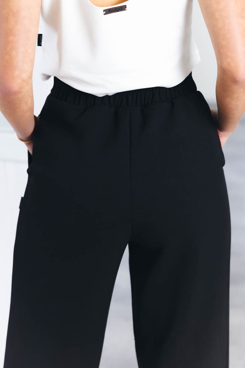 Pokud se vám zdají kalhoty Kiu Black známé, máte bod za pozorné oko. Vycházejí ze střihu oblíbených kalhot Malika, jsou jen trochu užší. Ponechali jsme jim širokou gumu v pase, šikovné kapsy a oblékli je do této krásné látky. Když ji naše Péťa uviděla, neváhala a hned ji kupovala.