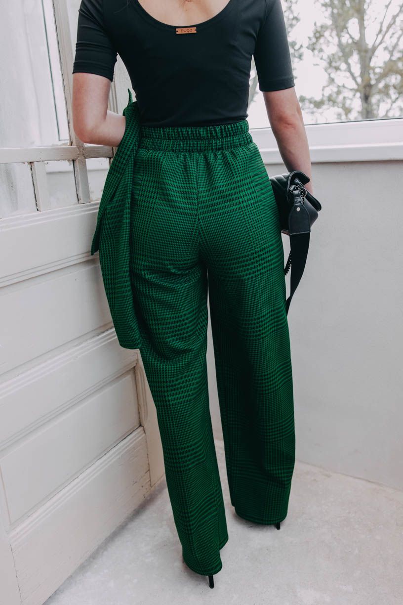 Pokud se vám Kiu Green zdají známé, máte bod za pozorné oko. Vycházejí ze střihu oblíbených kalhot Malika, jsou jen trochu užší. Ponechali jsme jim širokou gumu v pase, šikovné kapsy a oblékli je do této krásné zelené látky se vzorem letošního podzimu. Když ji naše Péťa uviděla, neváhala a hned ji kupovala.