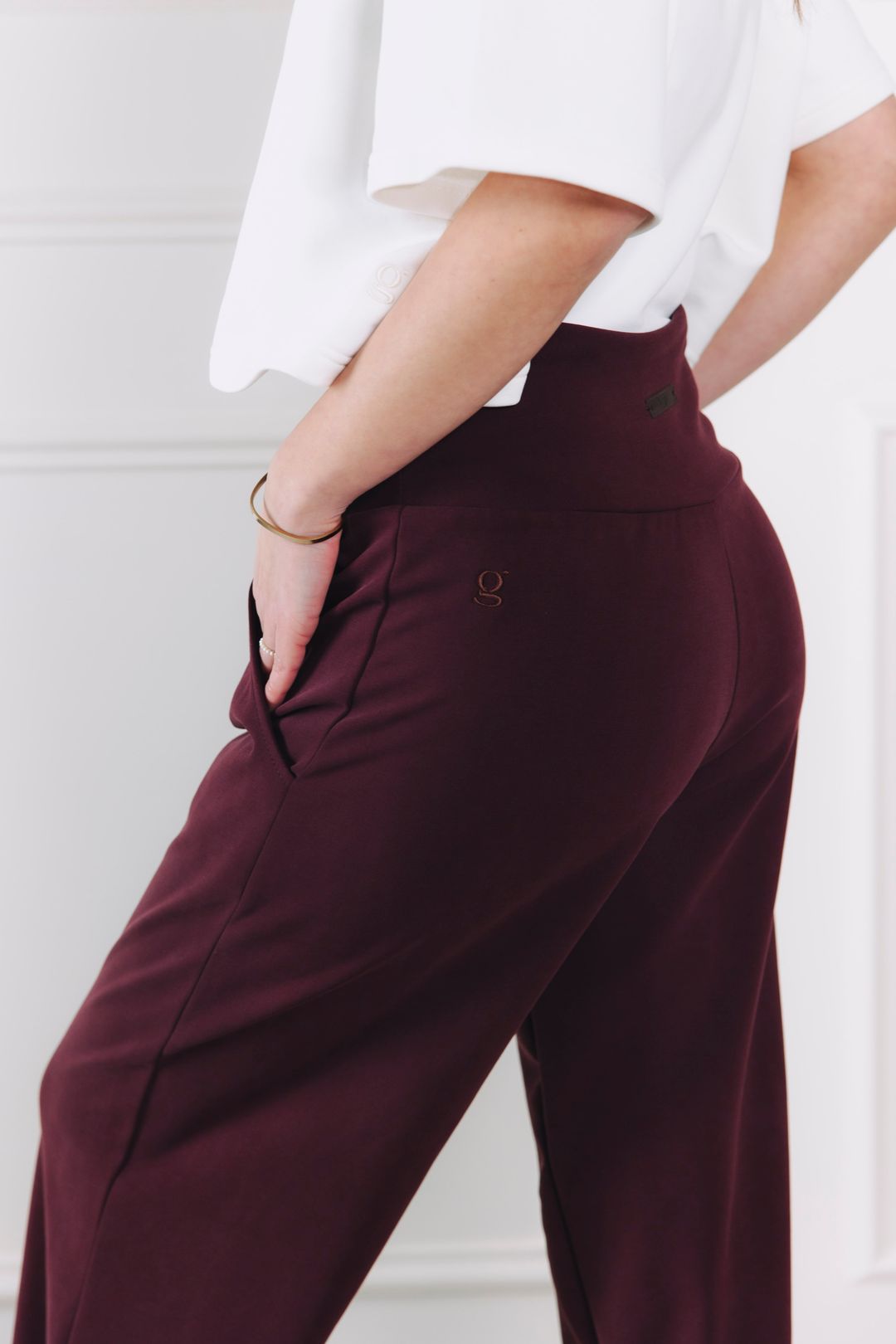 - Pas: Vysoký stahovací pas ze stejného materiálu, který krásně vytvaruje postavu a drží, aniž by omezoval nebo tlačil.