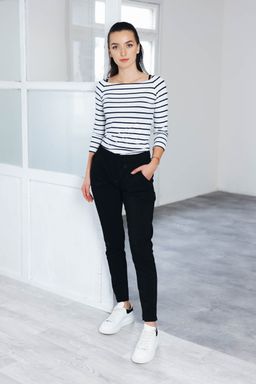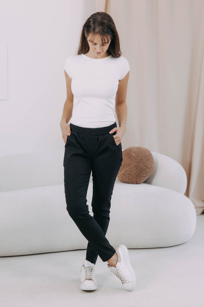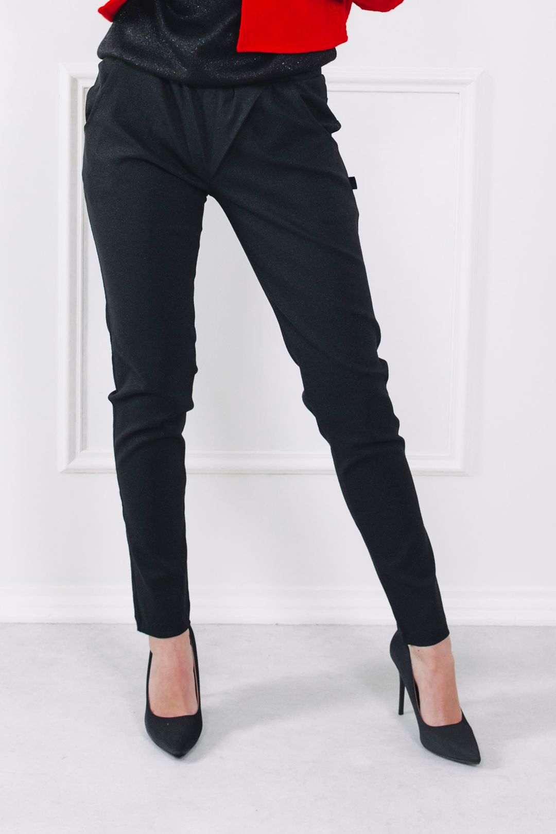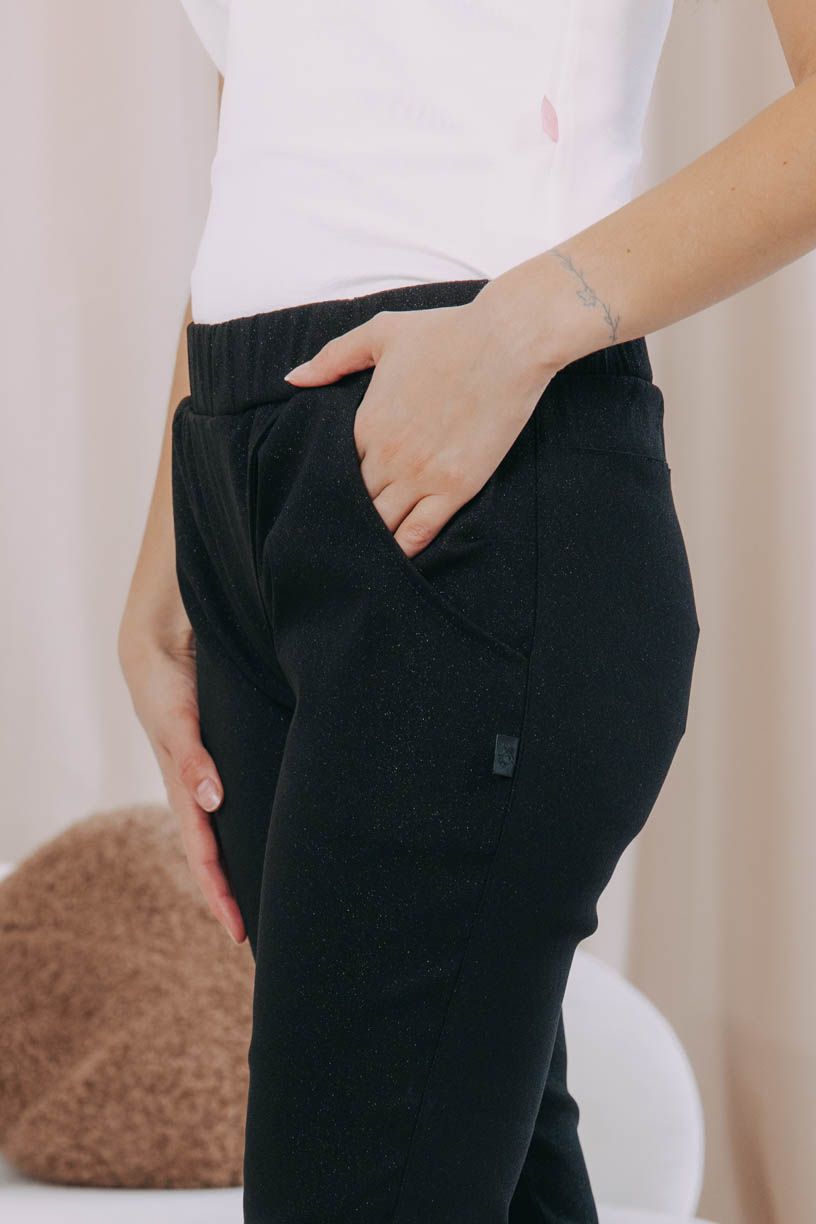 - Střih: Kalhoty mají úzký střih s rafinovanou širokou gumou v pase, která se přizpůsobí a nikde netlačí.