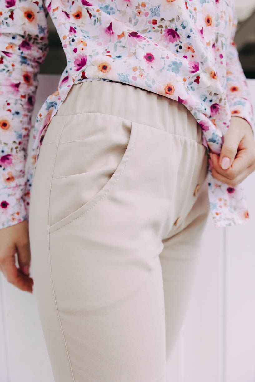Naší nejdůležitější podmínkou bylo pohodlí, čemuž jsme přizpůsobili celý návrh kalhot – žádný zip, ten nejpohodlnější pružný materiál, který se nemačká a drží tvar, a rafinovaně všitá široká guma v pase, aby vás nic netlačilo. Pár malých kapes na drobnosti doplňují ozdobné knoflíky.
