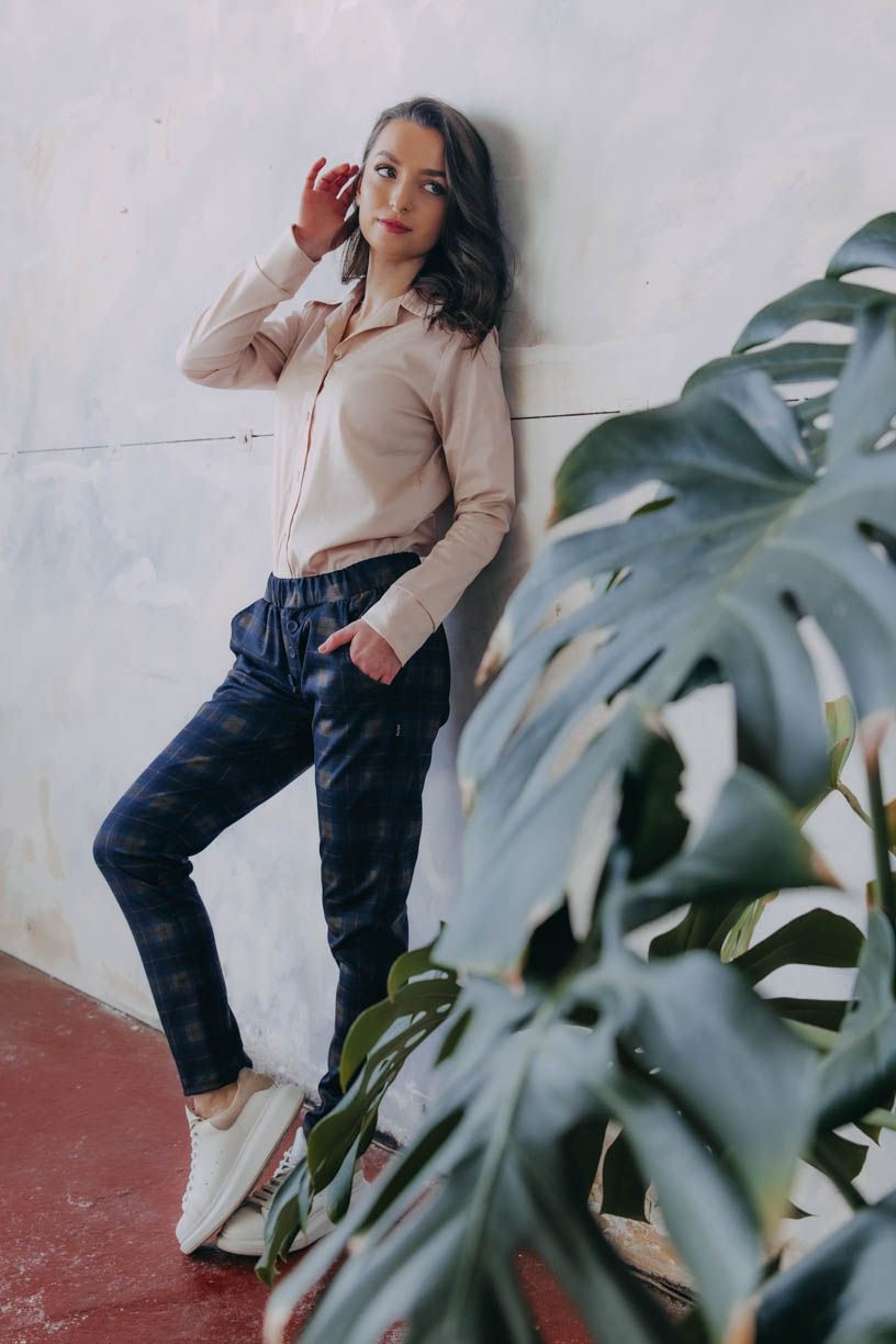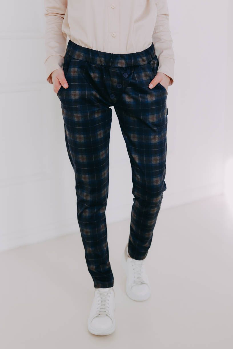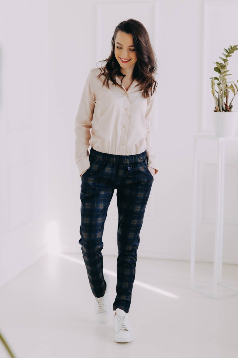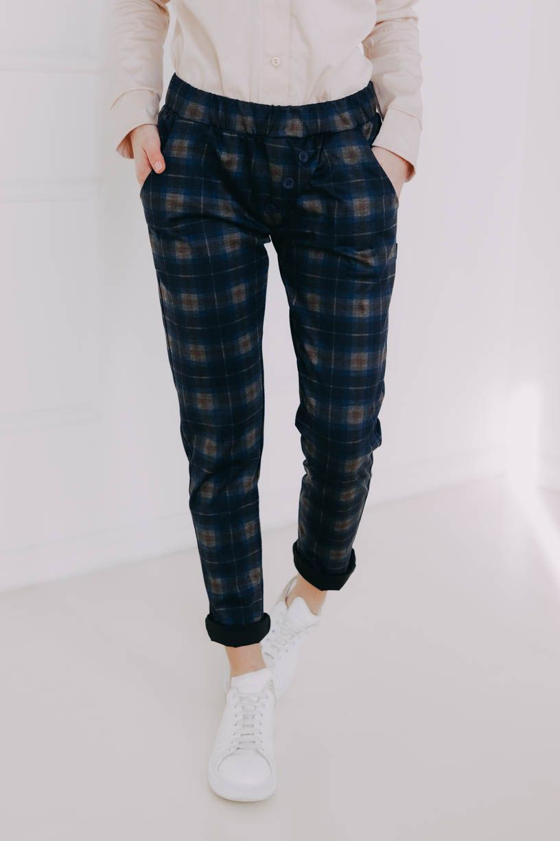 Naší nejdůležitější podmínkou bylo pohodlí, čemuž jsme přizpůsobili celý návrh kalhot – žádný zip, ten nejpohodlnější pružný materiál, který se nemačká a drží tvar, a rafinovaně všitá široká guma v pase, aby vás nic netlačilo. Pár malých kapes na drobnosti doplňují ozdobné knoflíky.