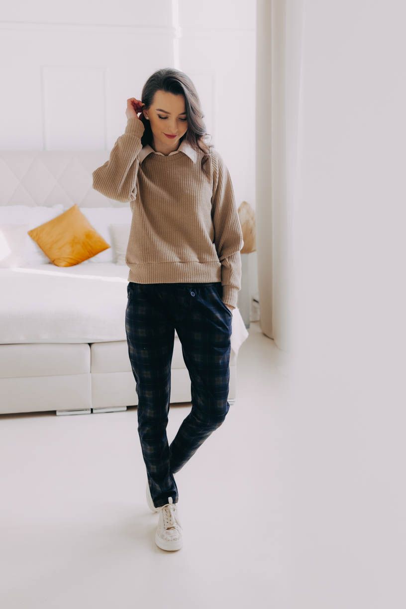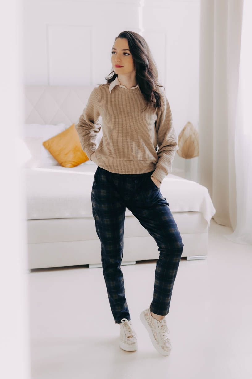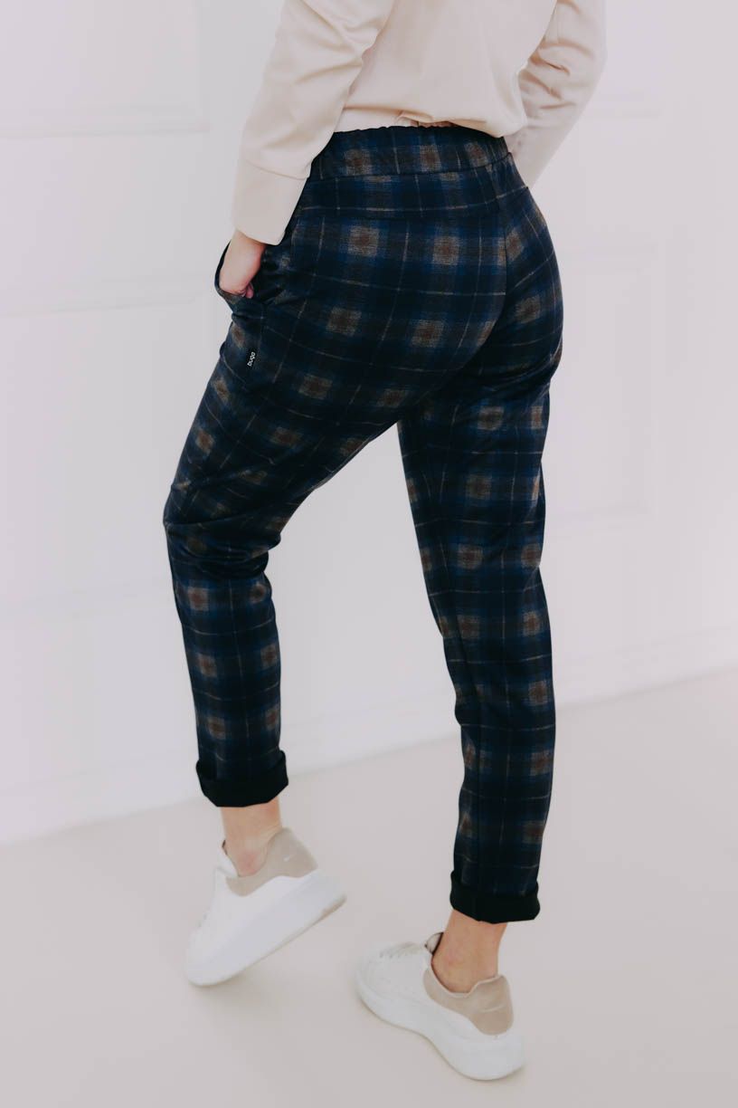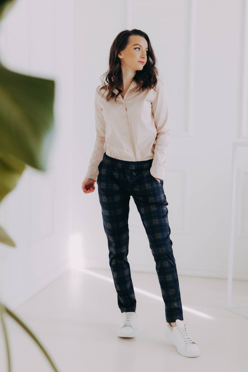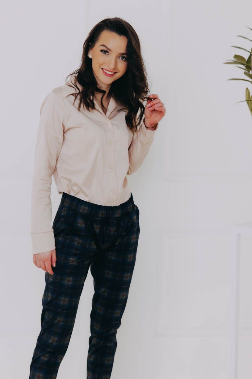 Naší nejdůležitější podmínkou bylo pohodlí, čemuž jsme přizpůsobili celý návrh kalhot – žádný zip, ten nejpohodlnější pružný materiál, který se nemačká a drží tvar, a rafinovaně všitá široká guma v pase, aby vás nic netlačilo. Pár malých kapes na drobnosti doplňují ozdobné knoflíky.