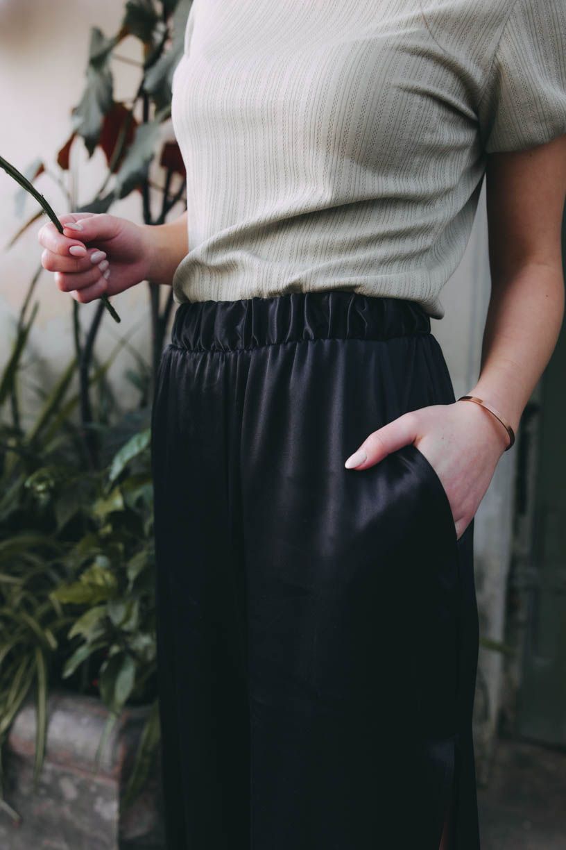 Jemně lesklá saténová viskóza se krásně leskne, příjemně splývá a pohladí vaše nohy při každém kroku. Boční rozparky odhalují přesně tolik, kolik je potřeba, přičemž tu lehkost v pohybu si užijete každou vteřinu, co v nich budete kráčet světem.