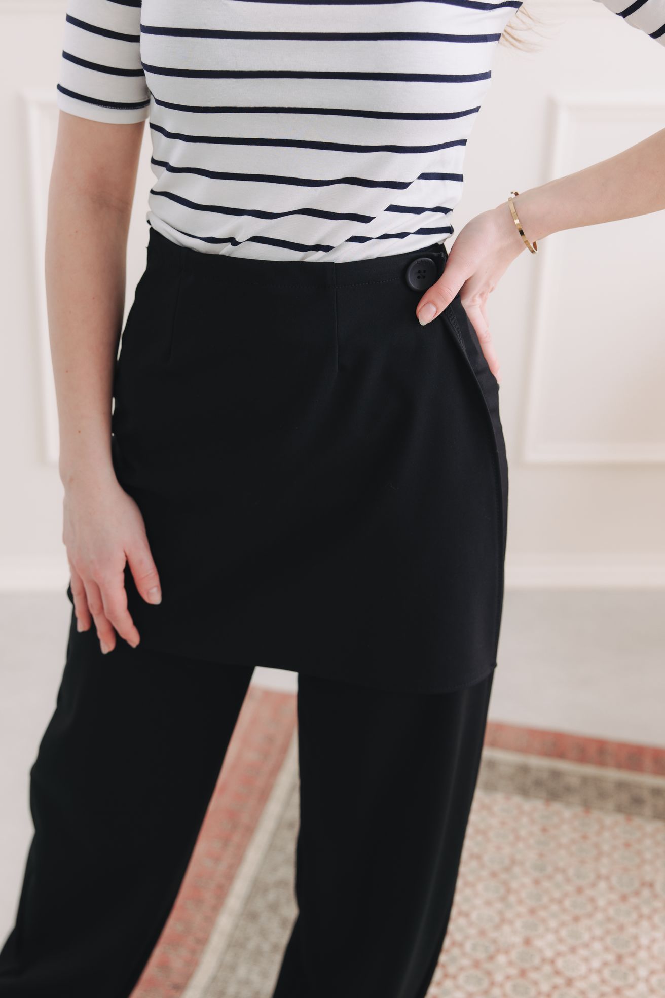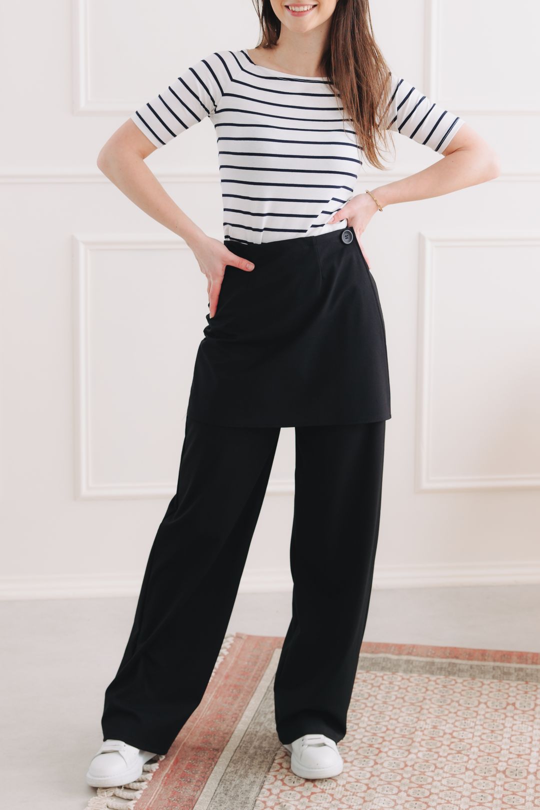 - Střih: Širší nohavice jsou doplněné o unikátní efekt krátké sukýnky v přední části. Maximální pohodlí zajišťuje pružný pas bez všité gumy, který nikde netlačí, a praktická kapsa na jedné straně, kterou oceníte při každé příležitosti.