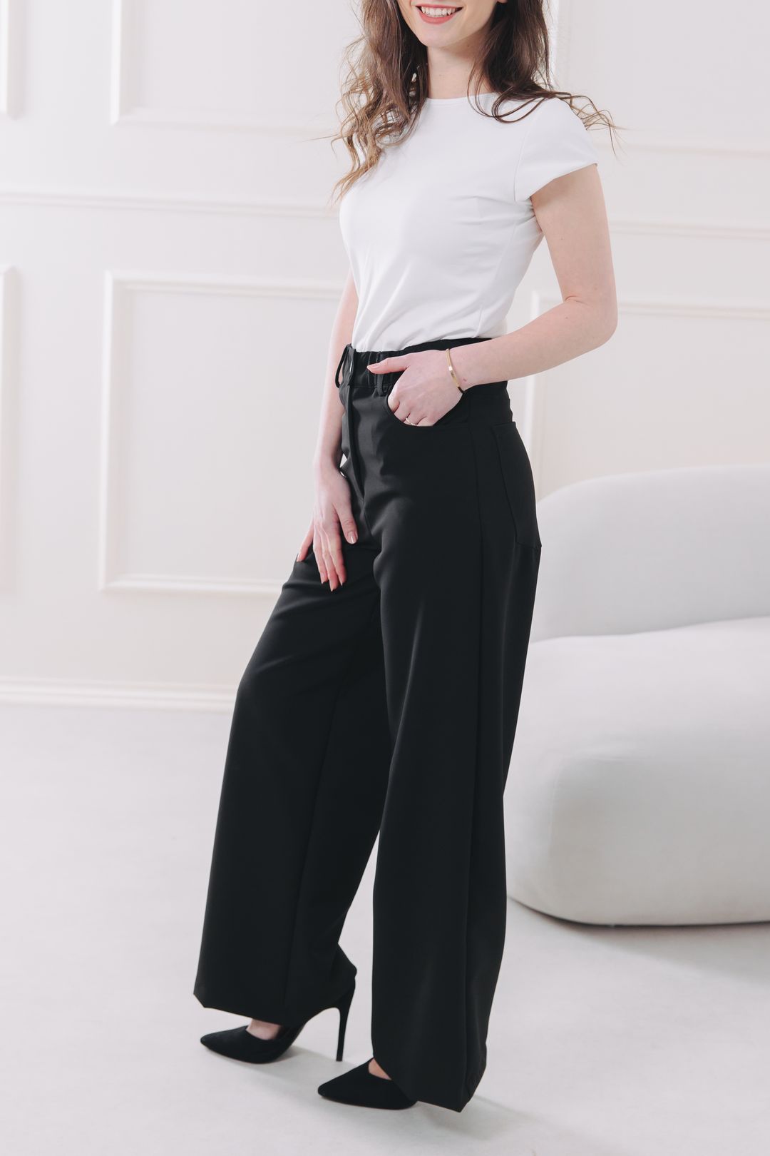 - Nadčasový střih: Moderní široké nohavice, které v kombinaci s vysokým pasem opticky prodlouží nohy a dodají postavě šmrnc.