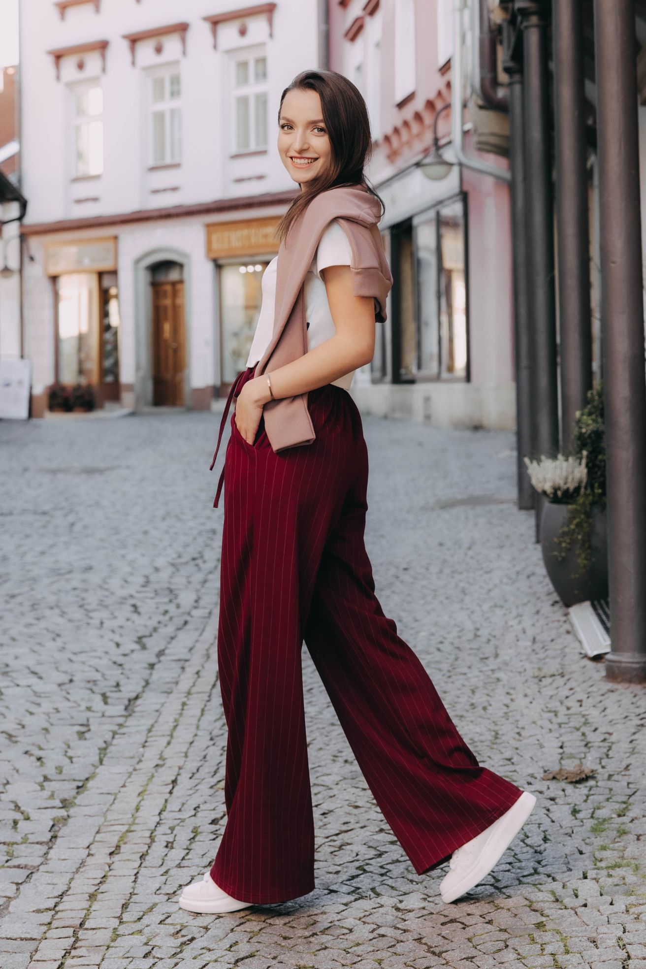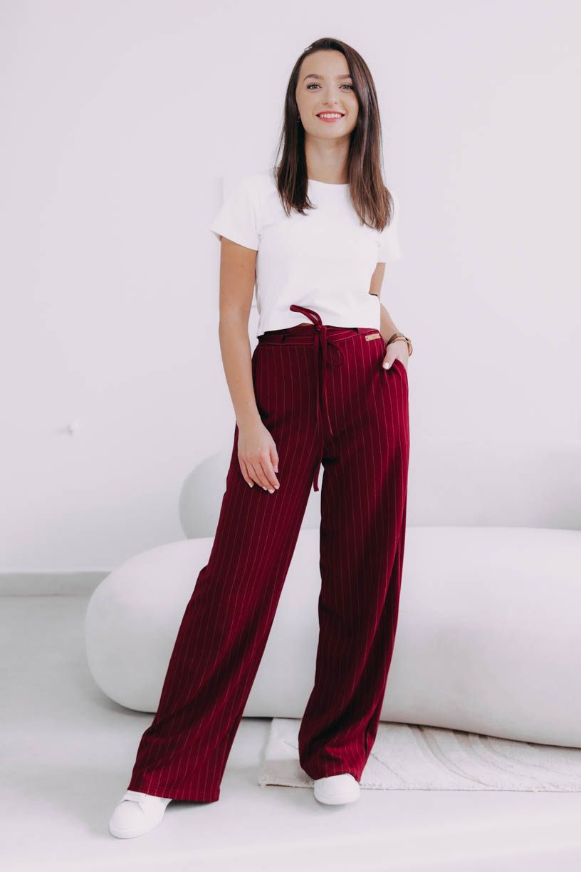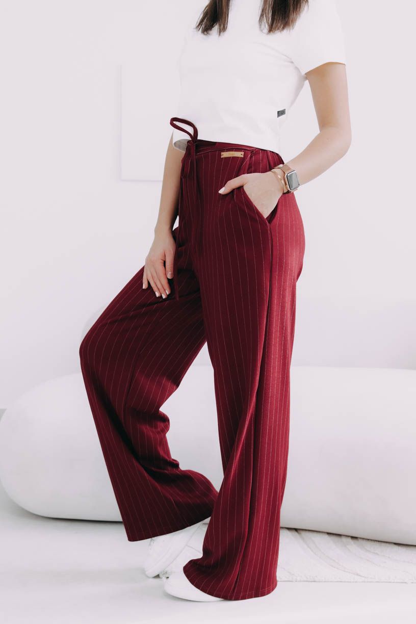 Vysoký pas a jemně nařasená zadní část s pružnou gumou nejenže vytvářejí elegantní siluetu, kterou opticky prodlužují svislé proužky, ale zaručují i dokonalé pohodlí během celého dne. Kapsy po stranách, kam si můžete pohodlně schovat ruce nebo drobnosti, a šňůrka vpředu, kterou si pas utáhnete, jim dodávají šmrnc, jako by vám byly ušité na míru.Volný a splývavý střih je přesně to, co potřebujete pro podzimní dny, kdy si chcete dopřát trochu volnosti – ideální na procházku parkem, když vám pod nohama šustí zlatavé listí, na kávu s přáteli či cestou do práce během chladného rána.