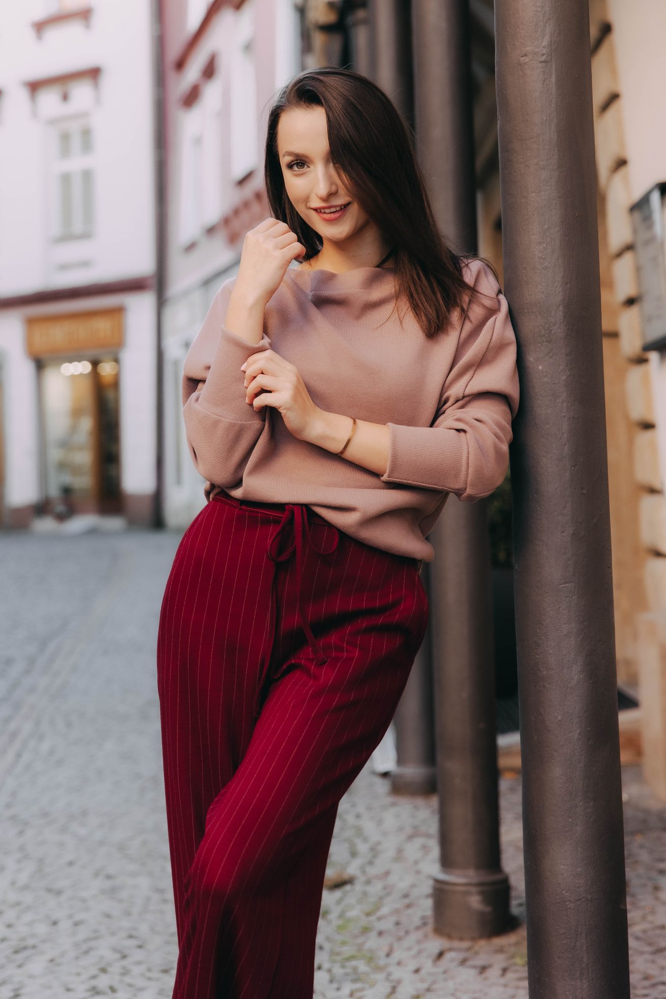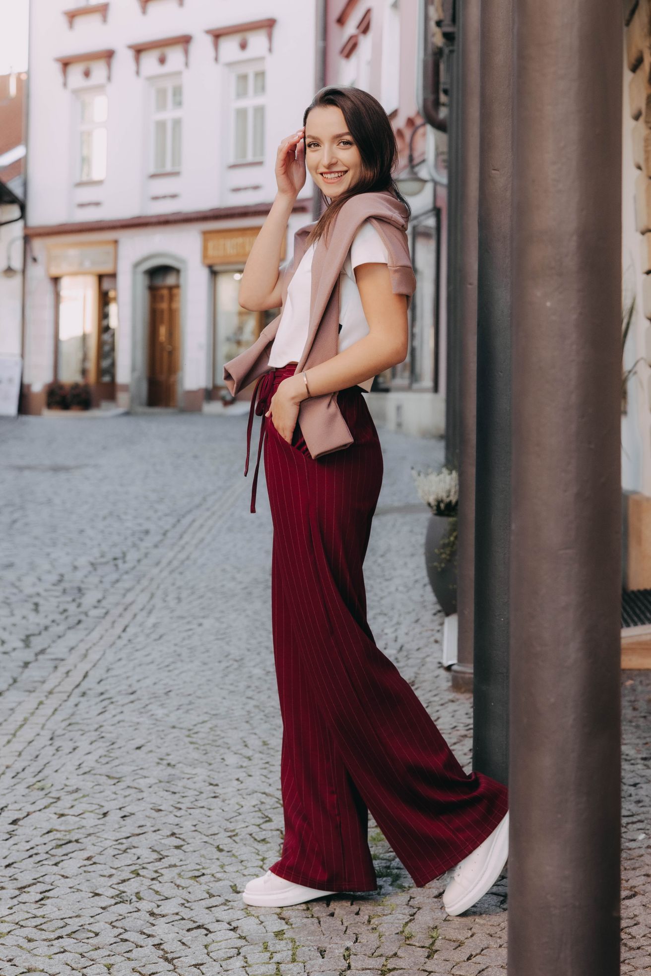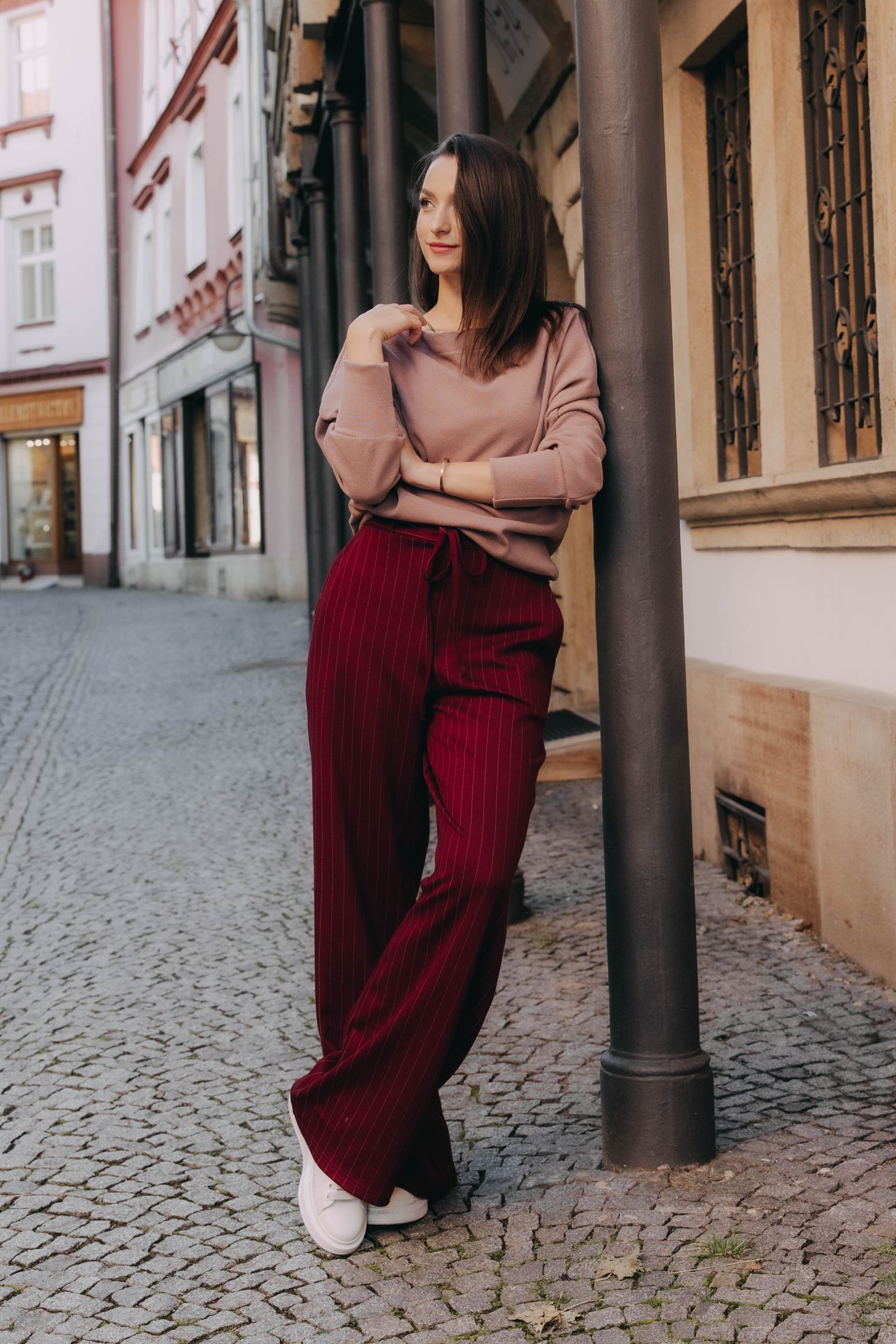 Vysoký pas a jemně nařasená zadní část s pružnou gumou nejenže vytvářejí elegantní siluetu, kterou opticky prodlužují svislé proužky, ale zaručují i dokonalé pohodlí během celého dne. Kapsy po stranách, kam si můžete pohodlně schovat ruce nebo drobnosti, a šňůrka vpředu, kterou si pas utáhnete, jim dodávají šmrnc, jako by vám byly ušité na míru.Volný a splývavý střih je přesně to, co potřebujete pro podzimní dny, kdy si chcete dopřát trochu volnosti – ideální na procházku parkem, když vám pod nohama šustí zlatavé listí, na kávu s přáteli či cestou do práce během chladného rána.