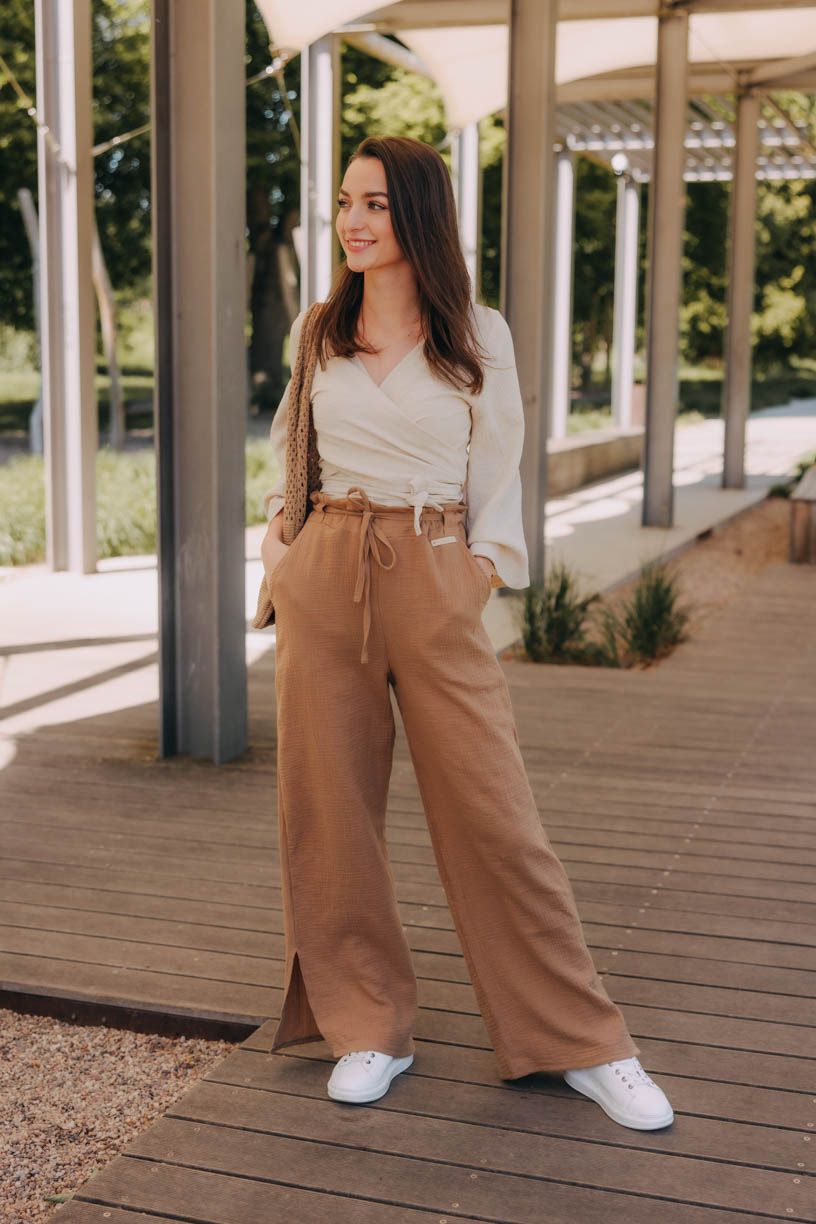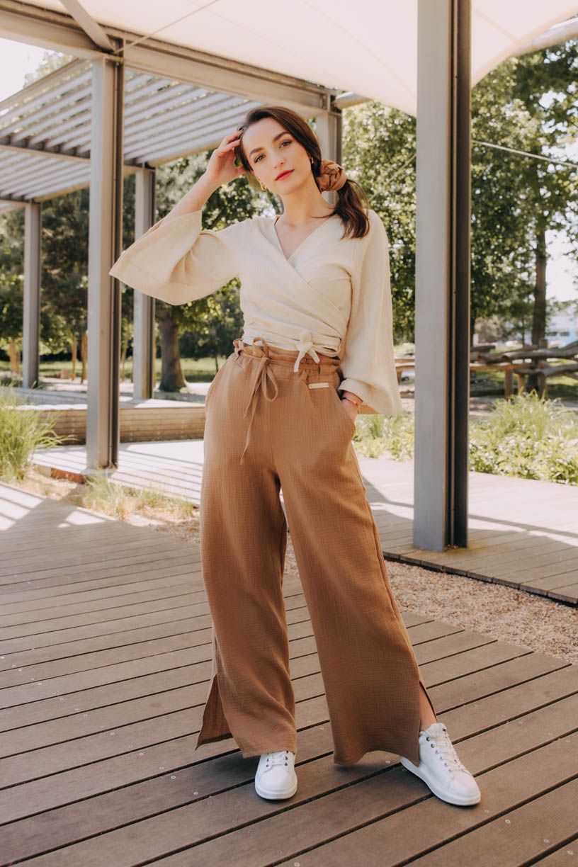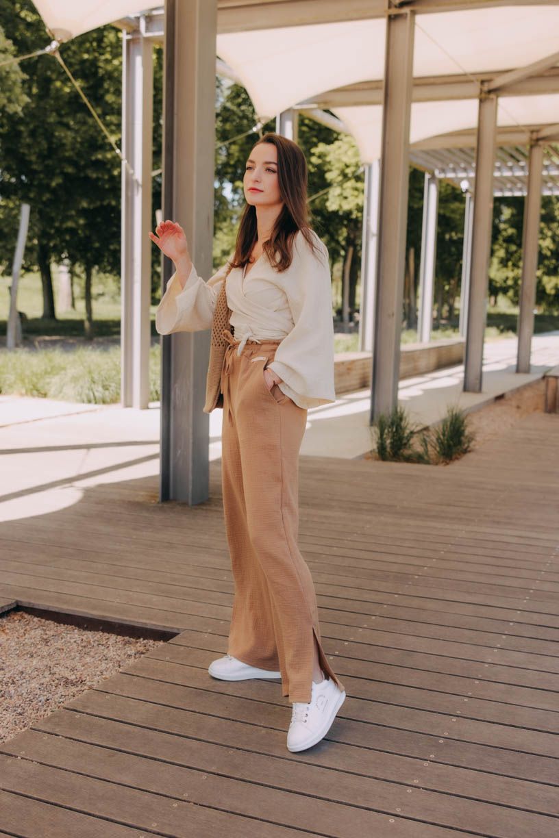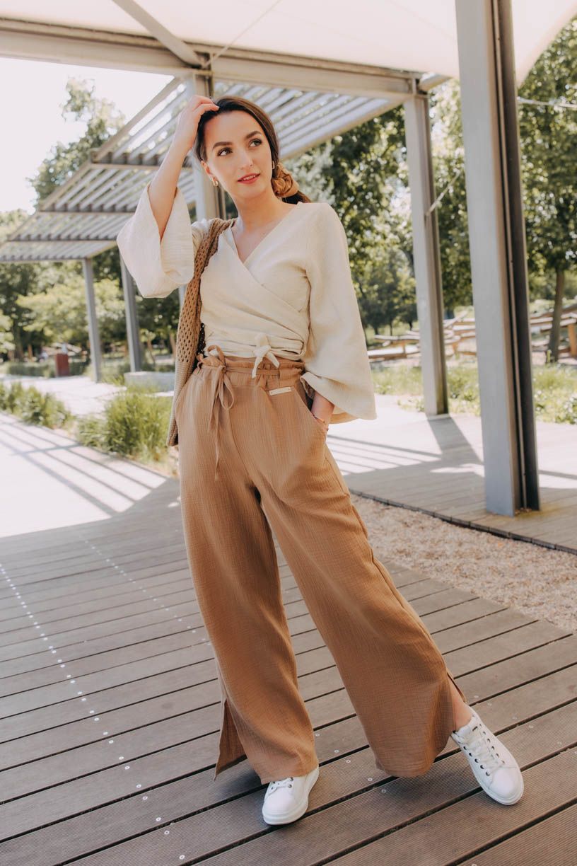 Jestli jste ještě neobjevily kouzlo širokých kalhot, je nejvyšší čas. Kalhoty Vito si okamžitě získaly vaše srdce, a tak jsme je oblékli do letnější verze. Kdo by chtěl trávit vedra v těsných kouskách, když můžete hupsnout do volného střihu s rozparky u kotníků. Široký pas si můžete posunout výš, nebo nechat v úrovni boků. Na bocích mají dvě menší kapsy, do kterých se vejde i pár drobností.