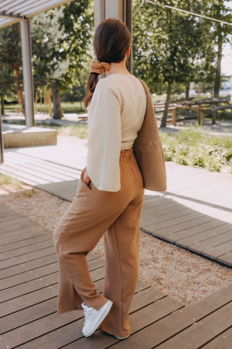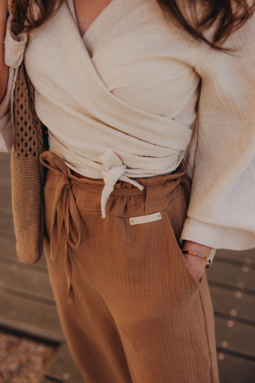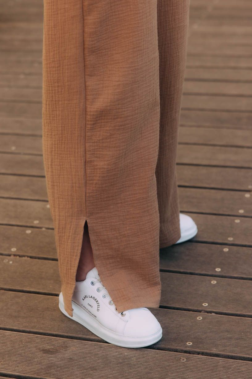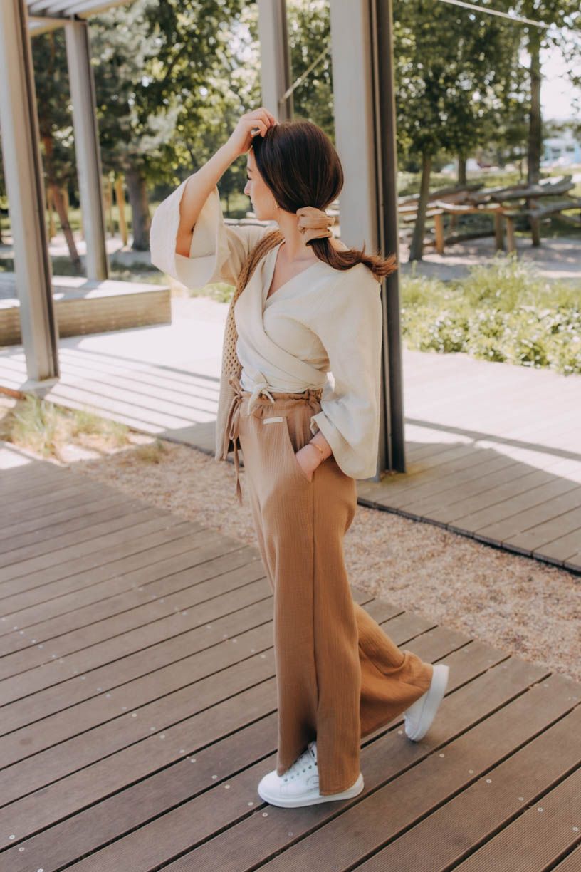 Jestli jste ještě neobjevily kouzlo širokých kalhot, je nejvyšší čas. Kalhoty Vito si okamžitě získaly vaše srdce, a tak jsme je oblékli do letnější verze. Kdo by chtěl trávit vedra v těsných kouskách, když můžete hupsnout do volného střihu s rozparky u kotníků. Široký pas si můžete posunout výš, nebo nechat v úrovni boků. Na bocích mají dvě menší kapsy, do kterých se vejde i pár drobností.