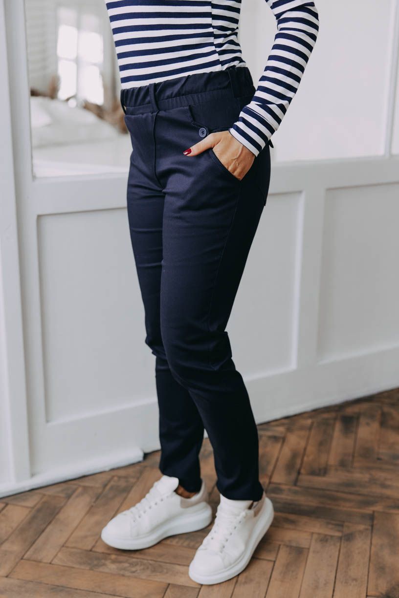 Dobře padnoucích kalhot v šatníku nikdy není dost. A jelikož ženské postavy jsou nesmírně rozmanité a každé z nás sedne něco jiného, Peťa opět čarovala s nůžkami a vytvořila pohodlné kalhoty Wisal v tmavě modré barvě. Střihově si pomohla stálicemi Elli, však taky není třeba vymýšlet kolo.