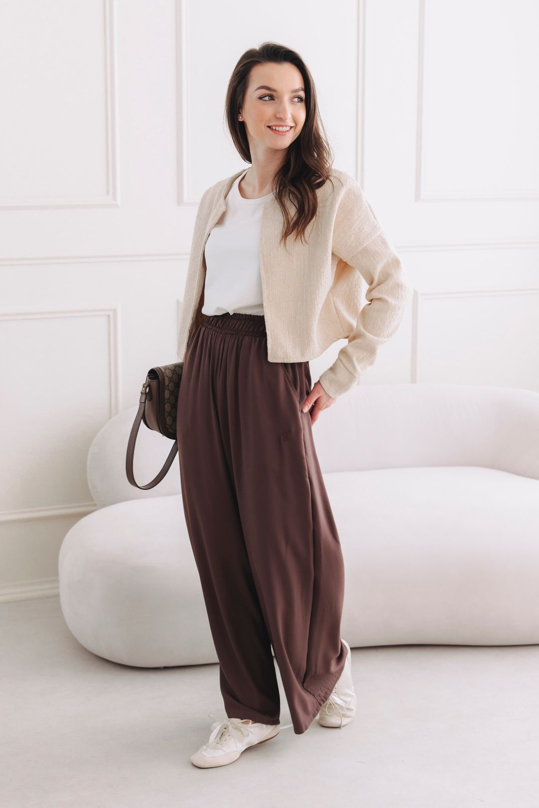 - Střih: Moderní „širokáče“ (wide-leg) s vysokým pasem a výraznou pružnou gumou po celém obvodu, která nikde netlačí a krásně definuje siluetu.