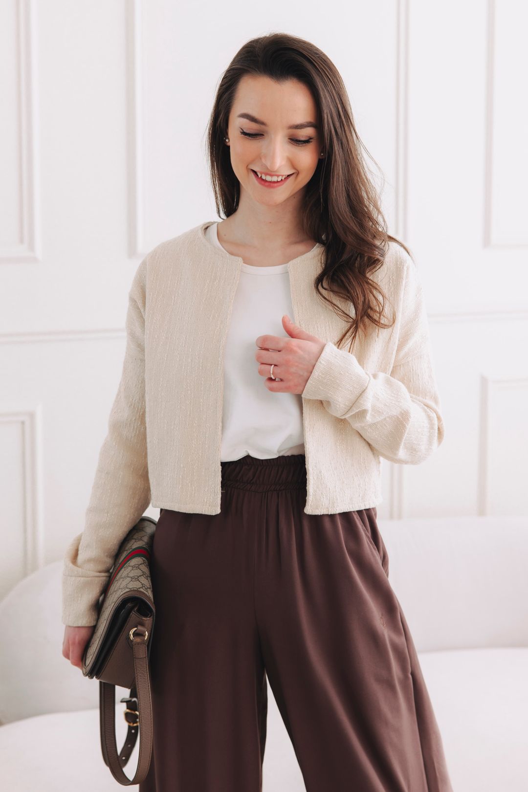 - Office look: Oblečte ke kalhotám bílý top z naší kolekce White Tee, který zastrčíte dovnitř, a navrch přehoďte krátké béžové sáčko. Vytvoříte čistý, světlý vzhled, ve kterém vynikne vaše ženskost i smysl pro módu. A boty? Lodičky klidně nechte doma. Tenhle outfit nejlépe doplní béžové elegantní mokasíny nebo balerínky.