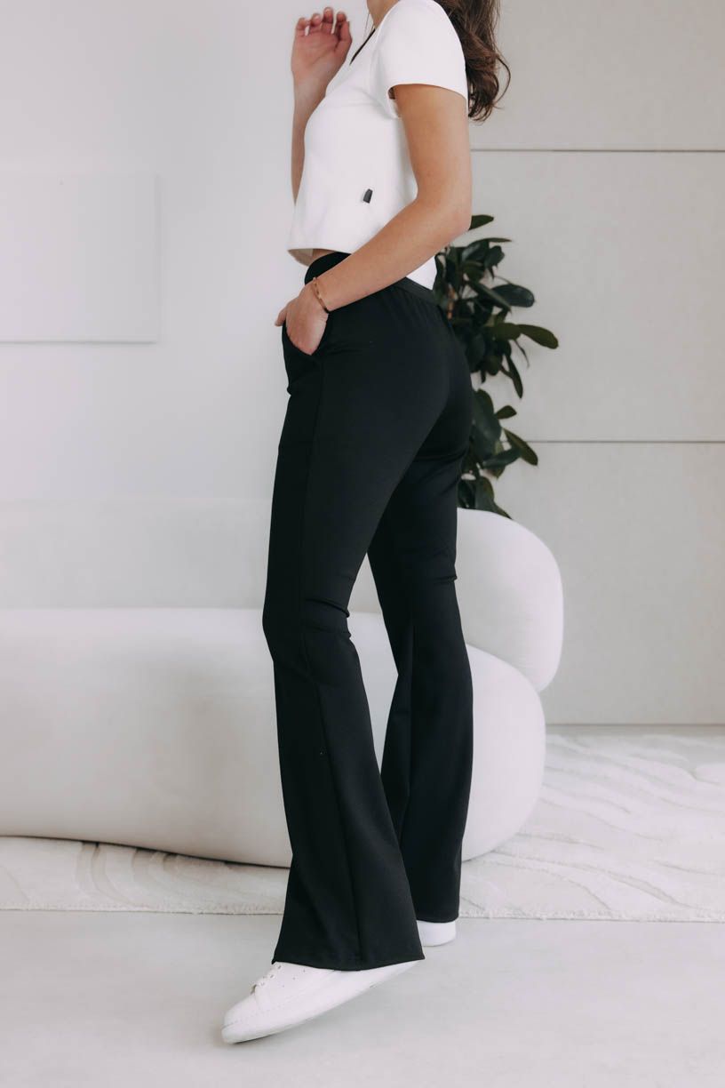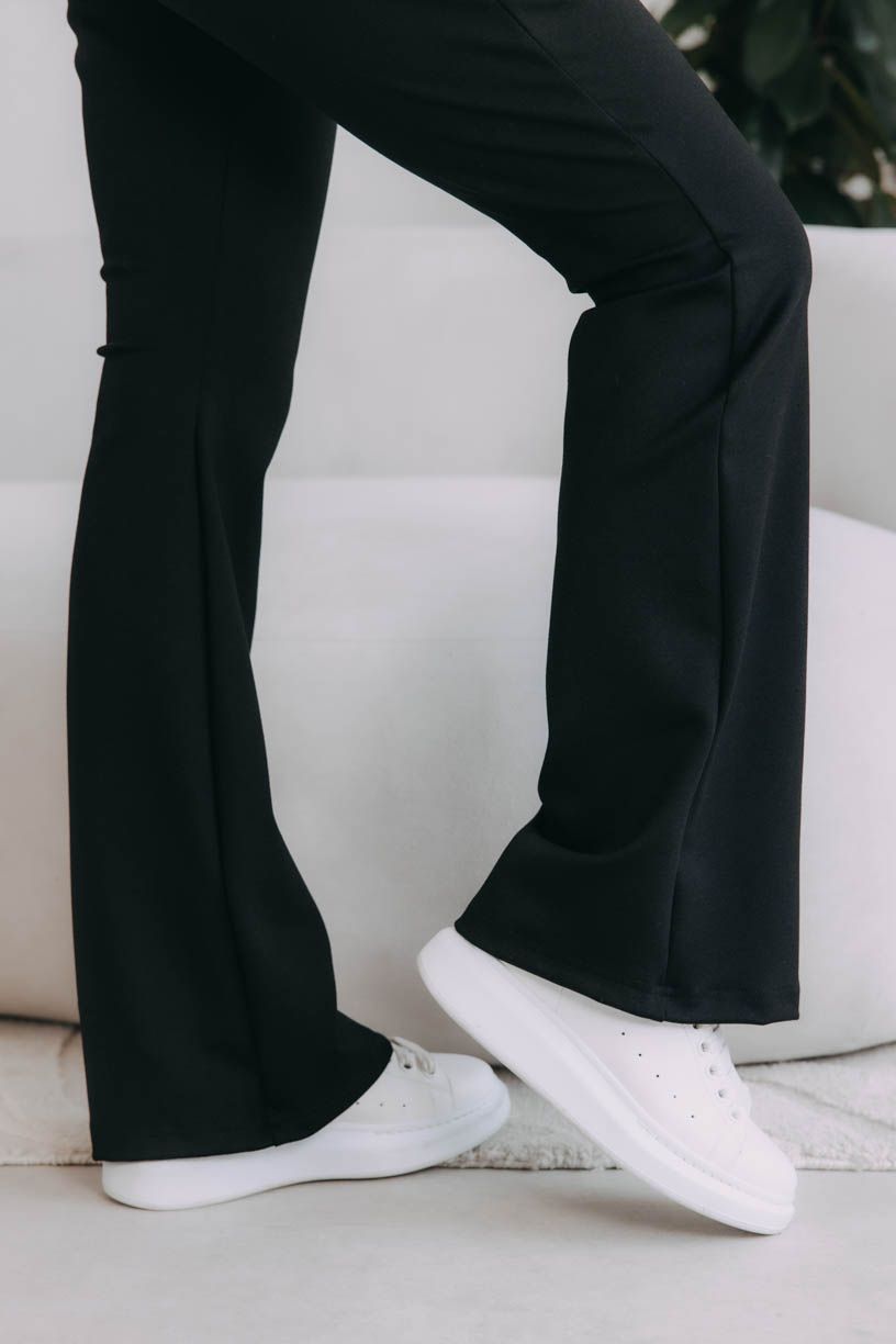 - Na elegantní událost: Zvolte boty na platformě nebo podpatky, které ještě více zvýrazní zvonový střih. Pro dokonalý outfit k nim oblékněte vestu na holé tělo.