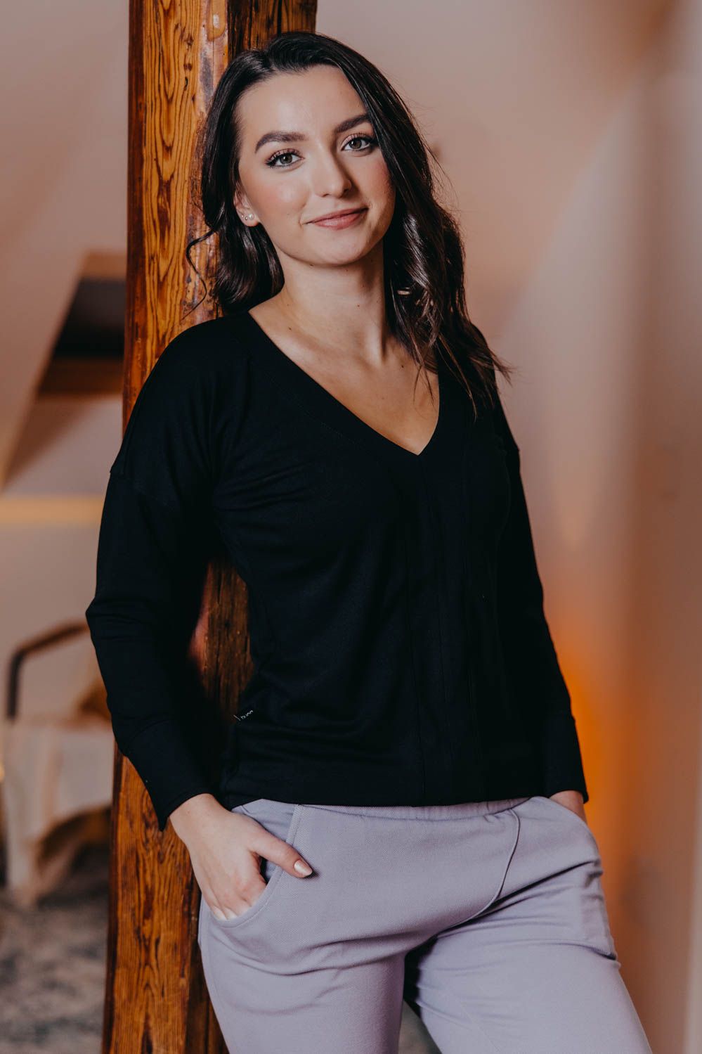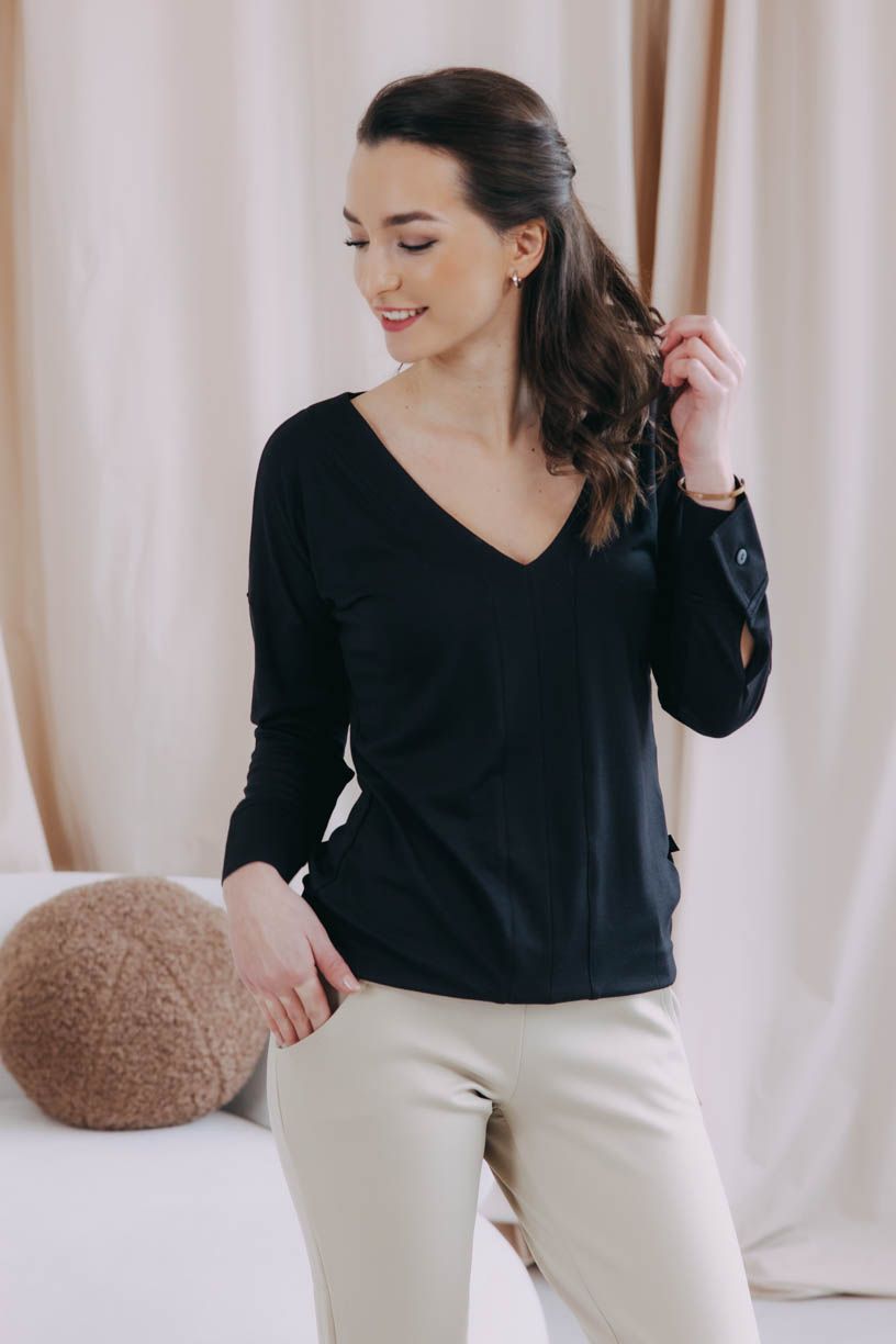 Košile Etiah má místo límečku a knoflíků rafinovaný véčkový výstřih a nápadité švy na přední straně. Netradiční kousek nejen do kapsulového šatníku.