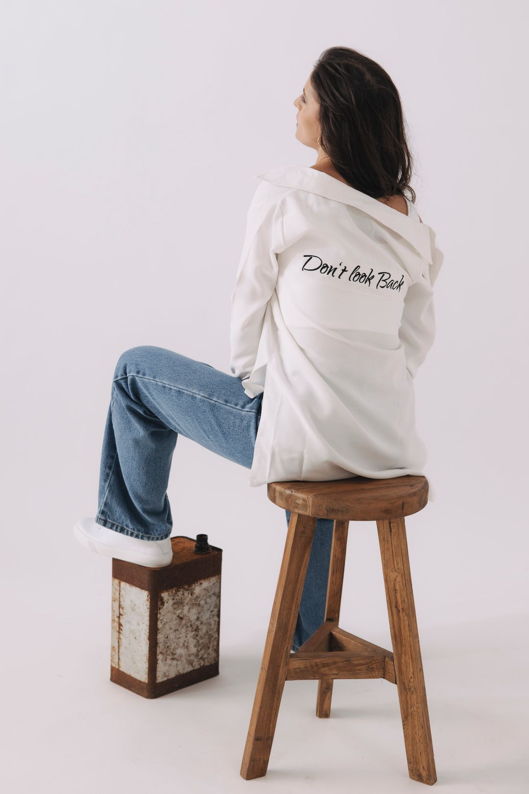 A tahle košile má něco navíc: nápis na zádech „Don’t Look Back“, který symbolizuje odvahu, sebevědomí a pozitivní přístup k životu.